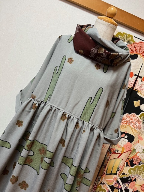 5891/未着用丹後縮緬/お花や雲などの模様でウエスト切替2WAYギャザーワンピース&リボン&ロングスヌード♪着物リメイク♪~♪ 收藏