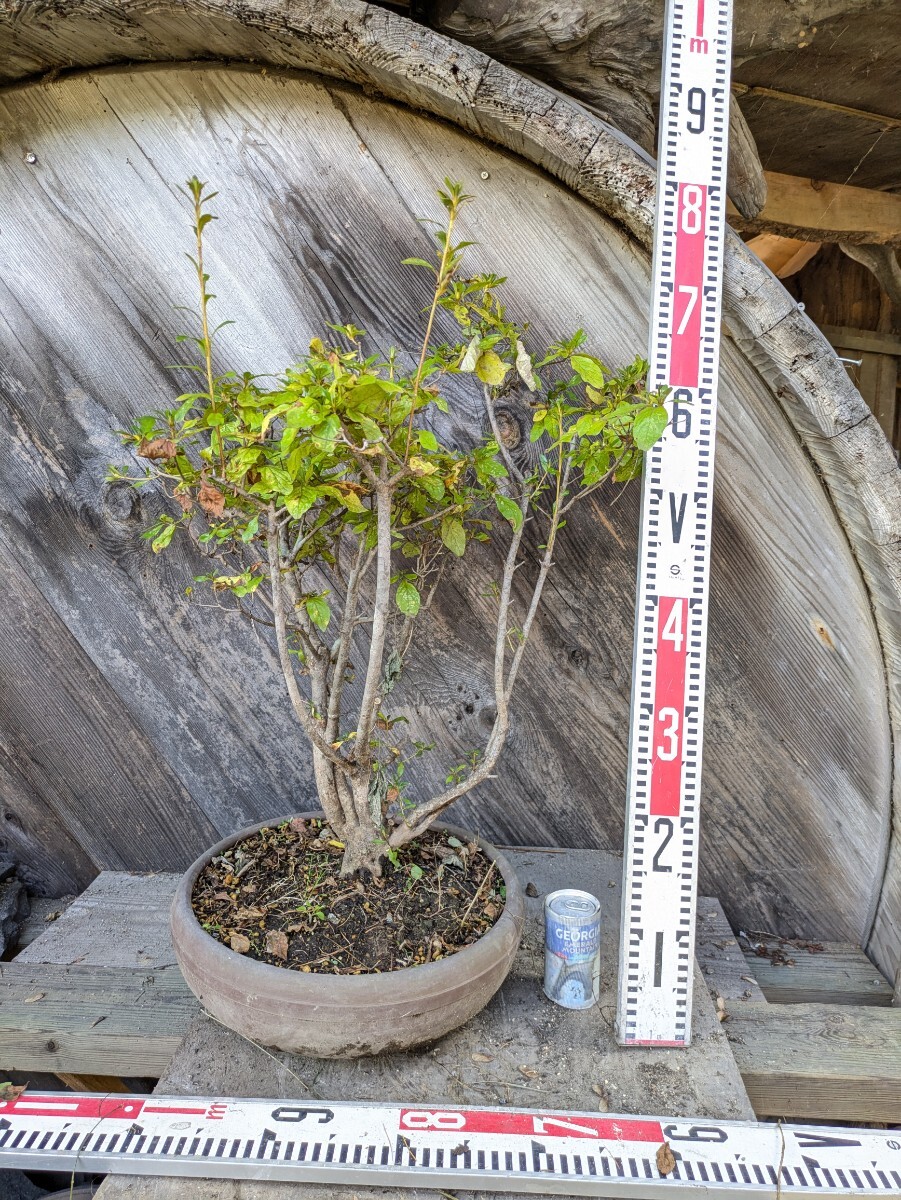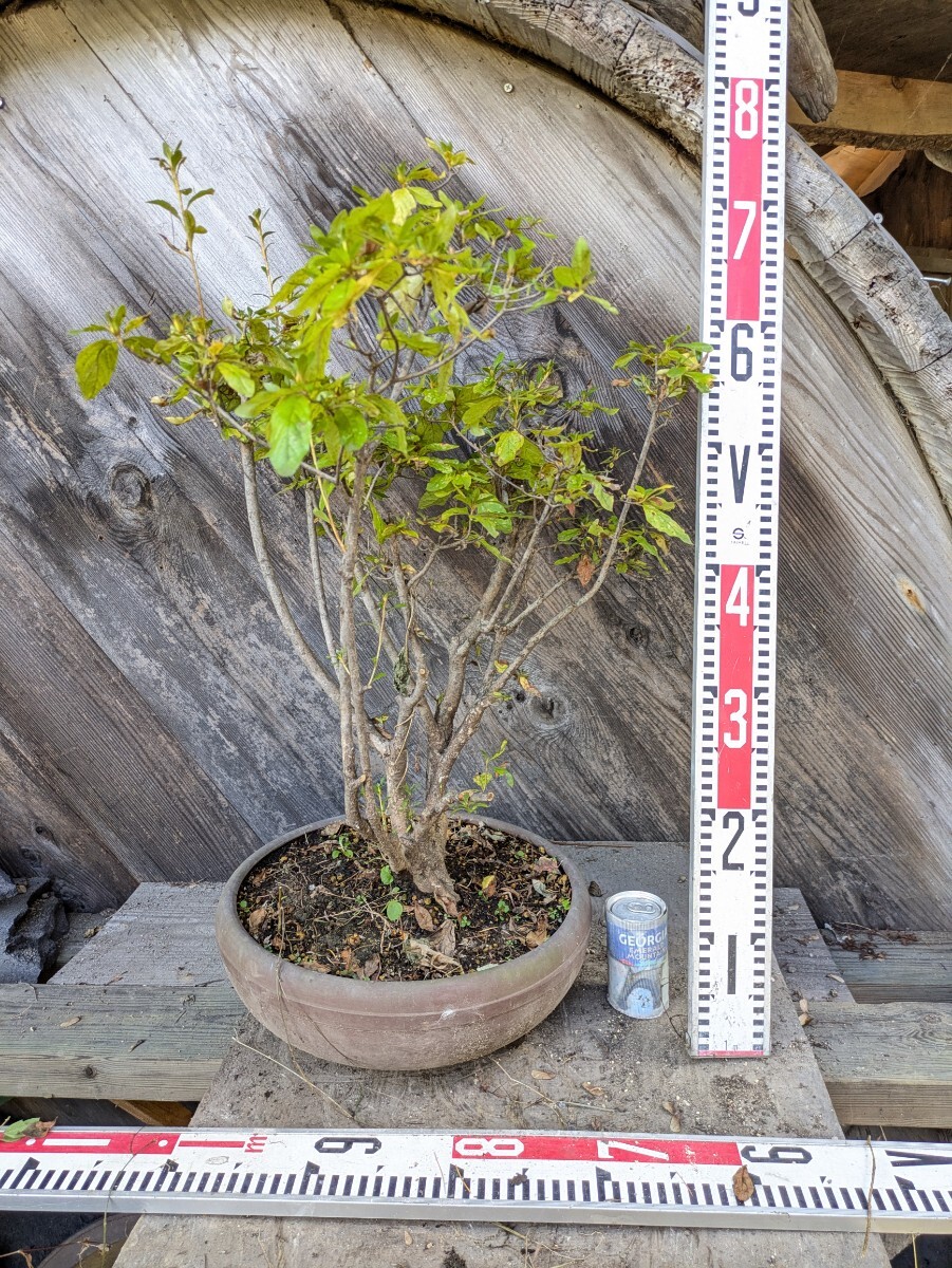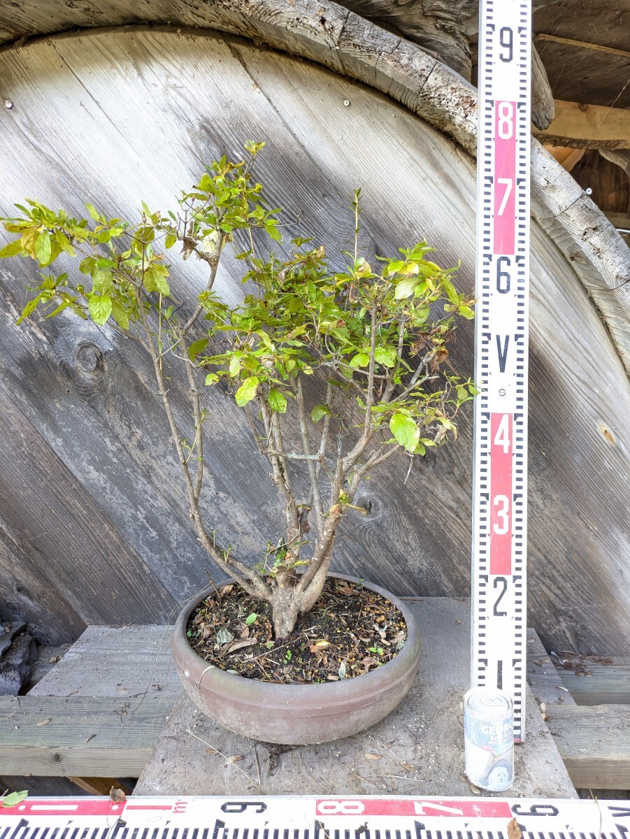 およそは45x45x70cmの枠に入るサイズ。根本付近からの高さは58cmくらい。長年の鉢作りで鉢は老朽化してます。来春の花芽も有ります。発送梱包の際に痛むヶ所が有るかもしれません。佐川急便にて発送する事も有ります。