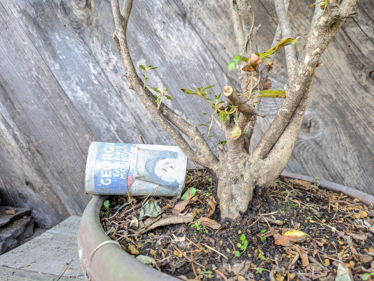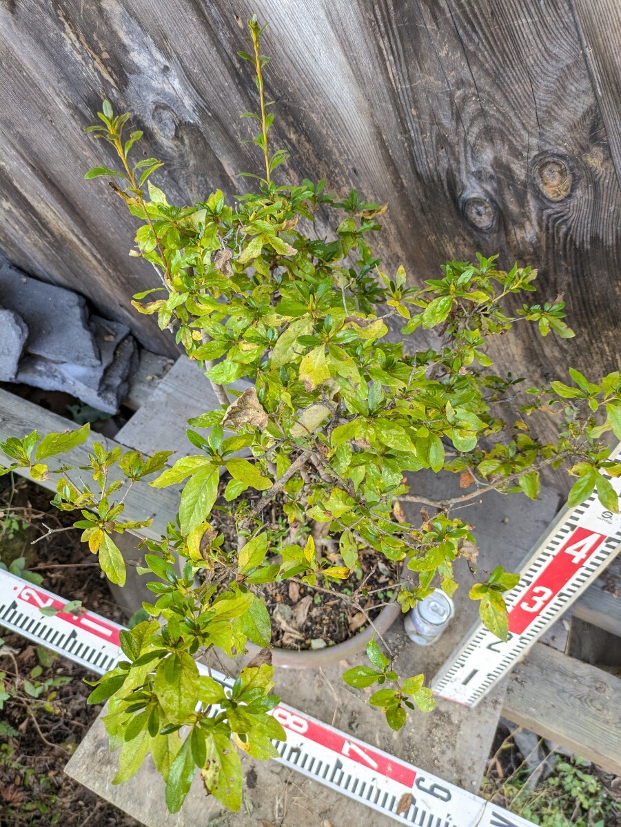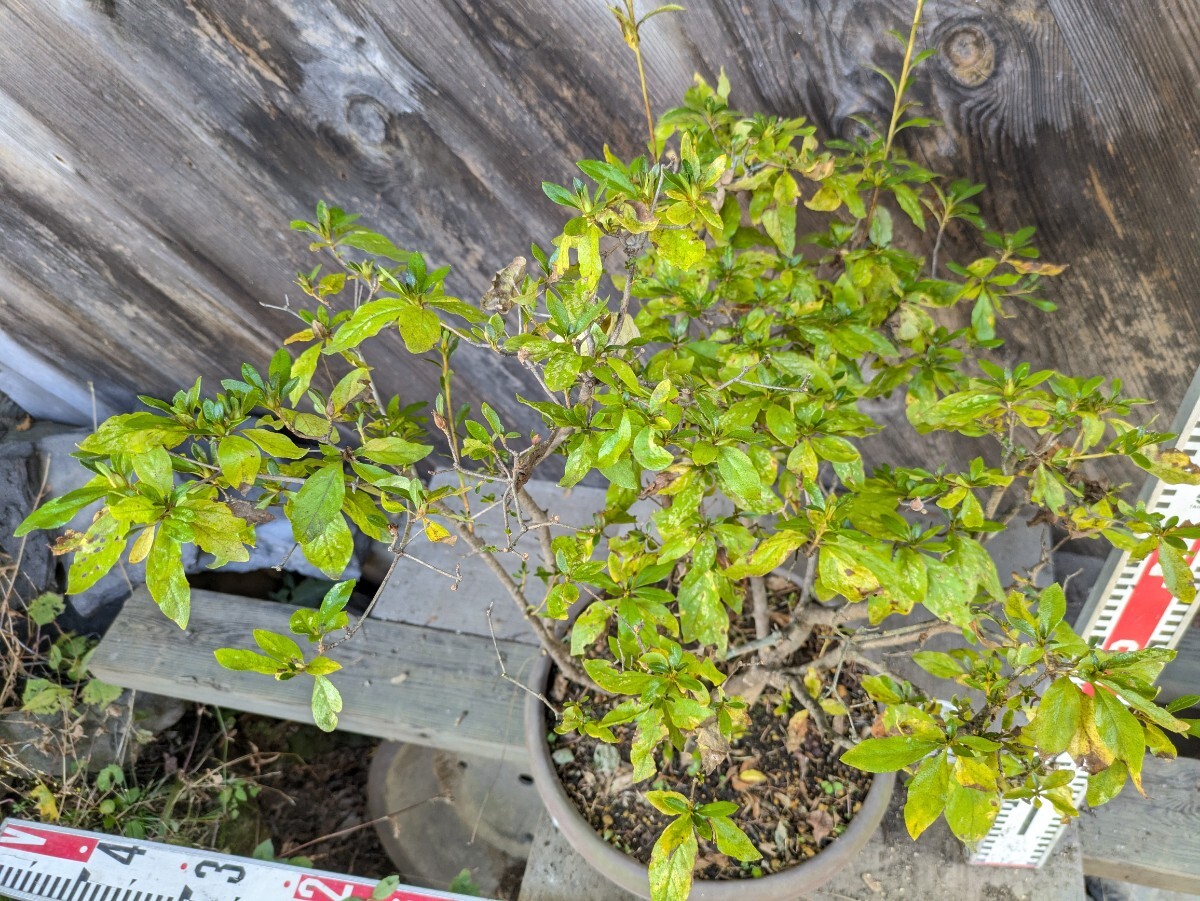 およそは45x45x70cmの枠に入るサイズ。根本付近からの高さは58cmくらい。長年の鉢作りで鉢は老朽化してます。来春の花芽も有ります。発送梱包の際に痛むヶ所が有るかもしれません。佐川急便にて発送する事も有ります。