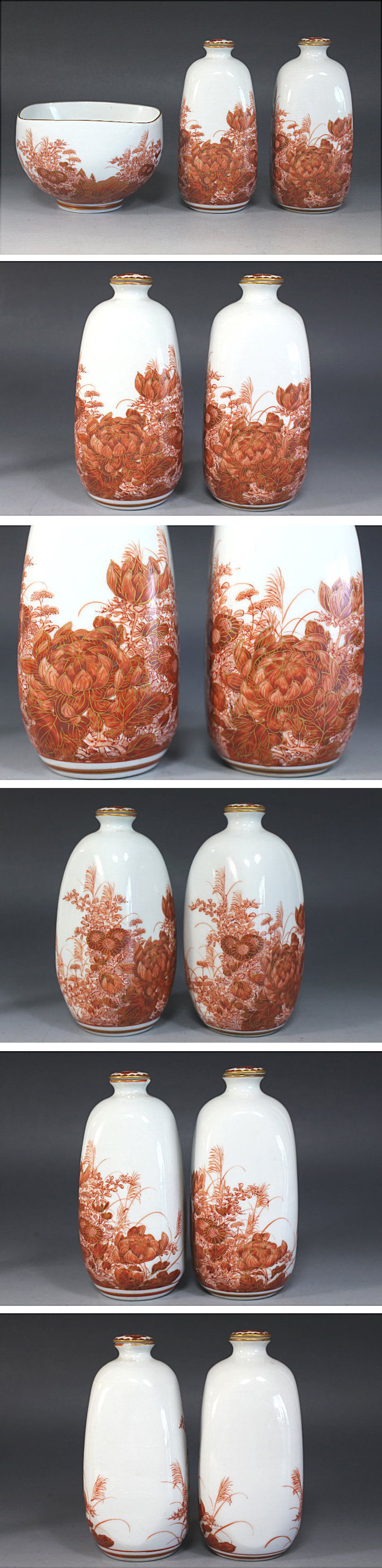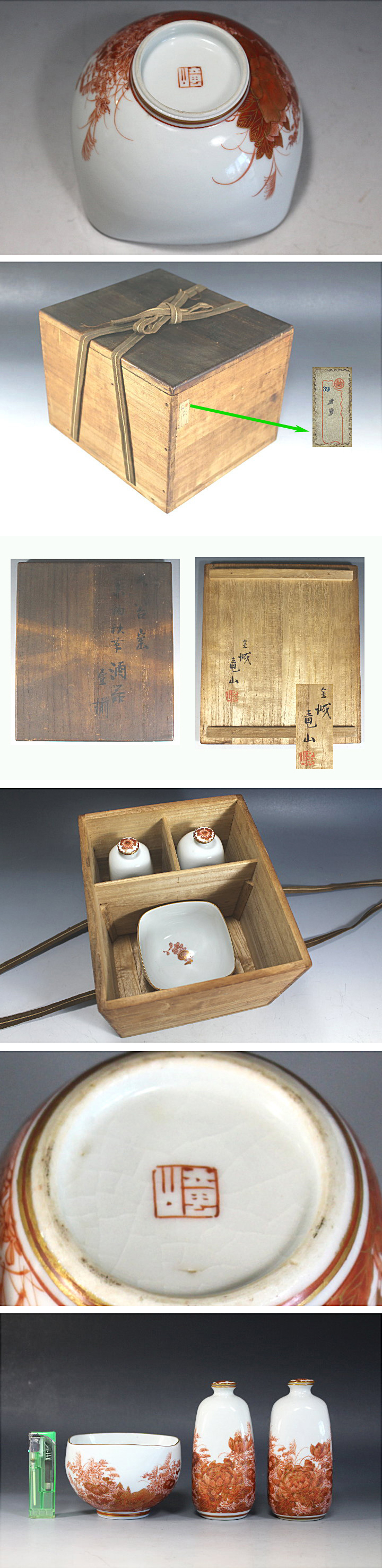 九谷焼 名工 金城竜山 九谷竜山金彩 赤絵秋草酒器 蓋付徳利 盃洗 共箱 石野竜山 検)須田菁華 仲田錦玉 北出星光 清水美山 北出不二雄 收藏
