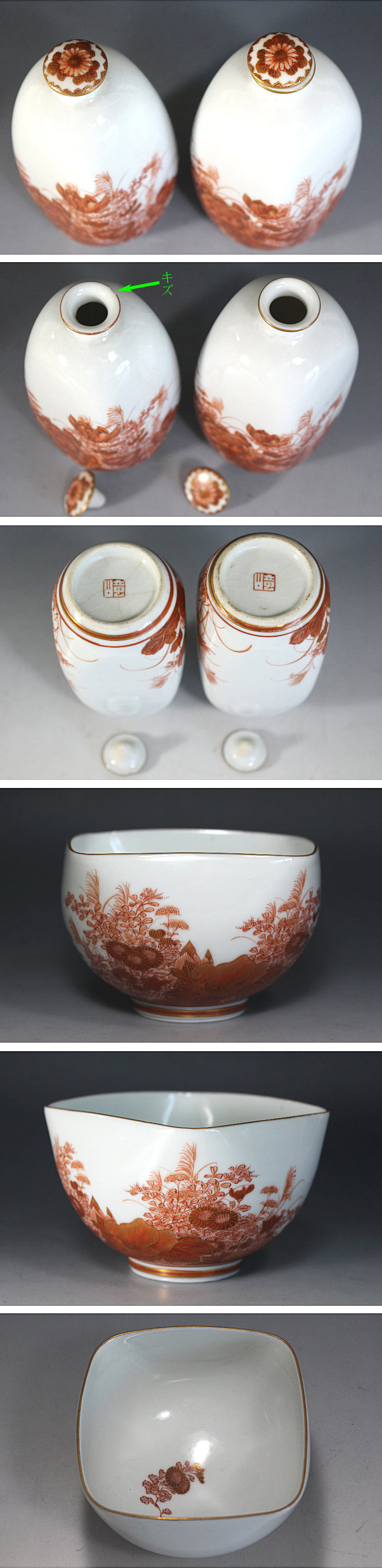 サイズ:高13.1cm(徳利 蓋共) 九谷焼 名工 金城竜山の 赤絵秋草酒器 共箱です。 表箱書きには 九谷窰 赤釉秋草酒器 壹揃 とあります。 残念ですが蓋付徳利2点と盃洗が1点だけです。 徳利の1点には小さなホツがあります。(写真参照) 桐箱には経年の汚れ・ヤケなどがあります。 蓋表に汚れがあります。 写真をご覧の上ご入札宜しくお願い致します。 ※ タイトルの「検」以下は検索ワードです。出品物と直接関係の無い名称も含まれます。 | |