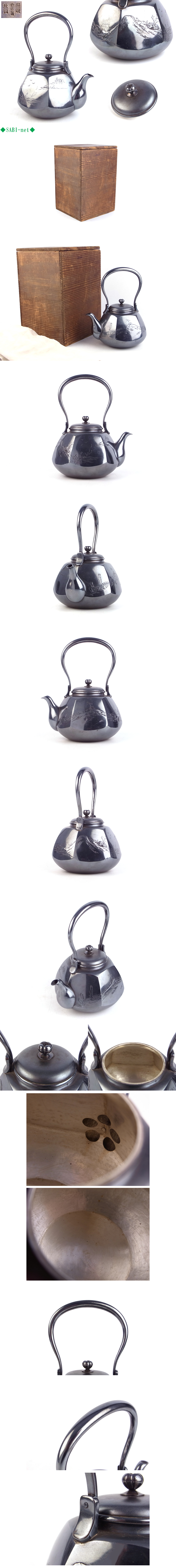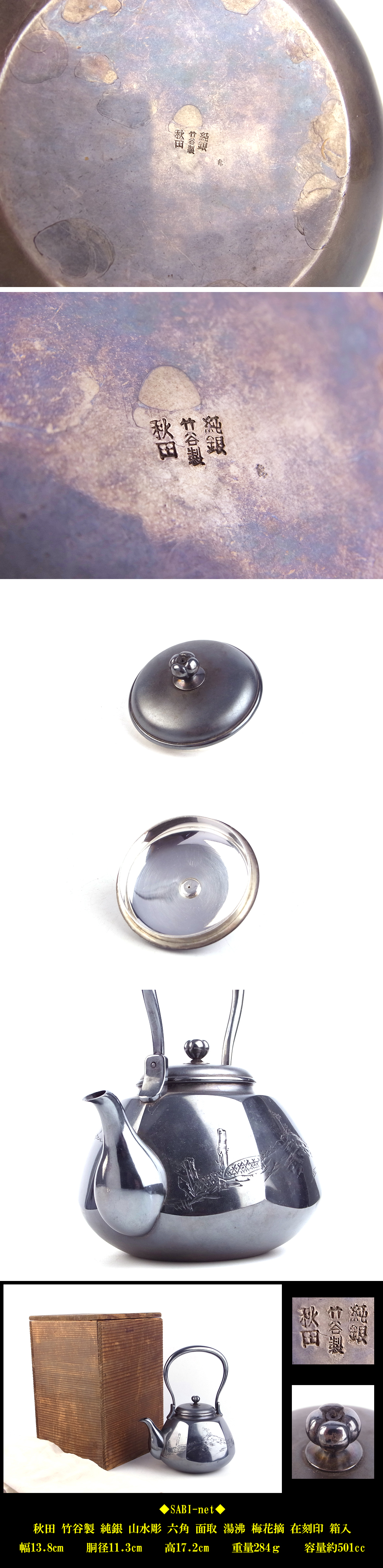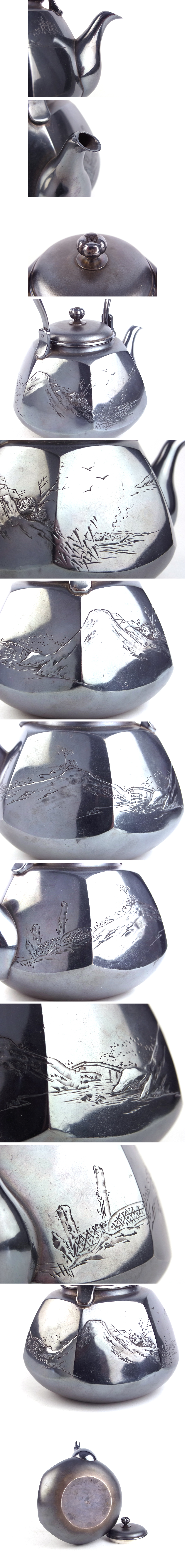 ◆SABI◆ 秋田 竹谷製 純銀 山水彫 六角 面取 湯沸 在刻印 箱入 重量284g 容量約501cc◆ 煎茶 銀瓶 南鐐 金工 彫刻 舟 千鳥 細密 收藏