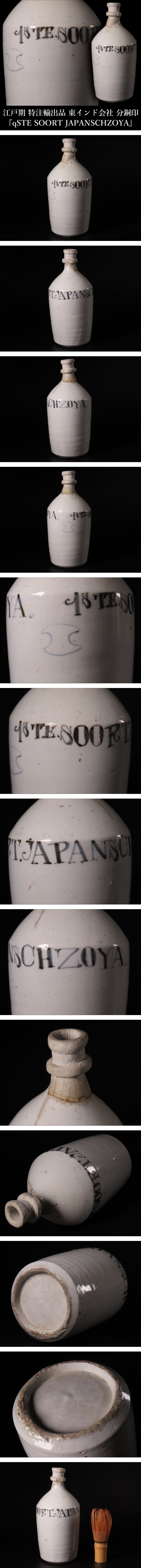 【ONE'S】江戸期 特注輸出品 東インド会社 VOC 分銅印 『qSTE SOORT JAPANSCHZOYA』 コンプラ瓶 高20cm 蘭瓶 醤油瓶 花瓶 飾壷 古美術品 | |||
