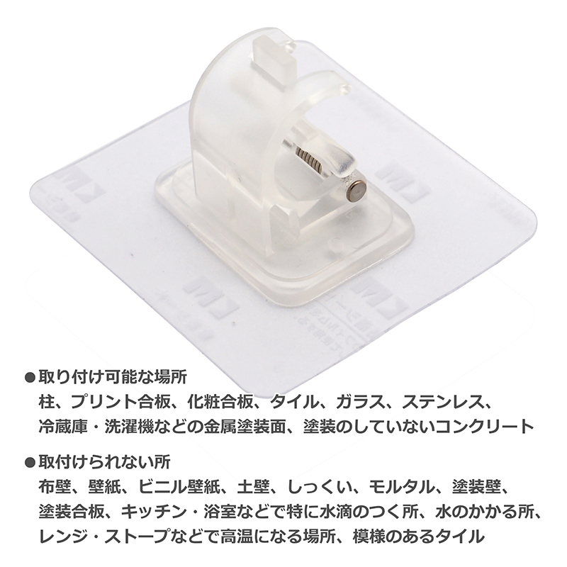 ●取り付け可能な場所:柱、プリント合板、化粧合板、タイル、ガラス、ステンレス、冷蔵庫・洗濯機などの金属塗装面、塗装のしていないコンクリート