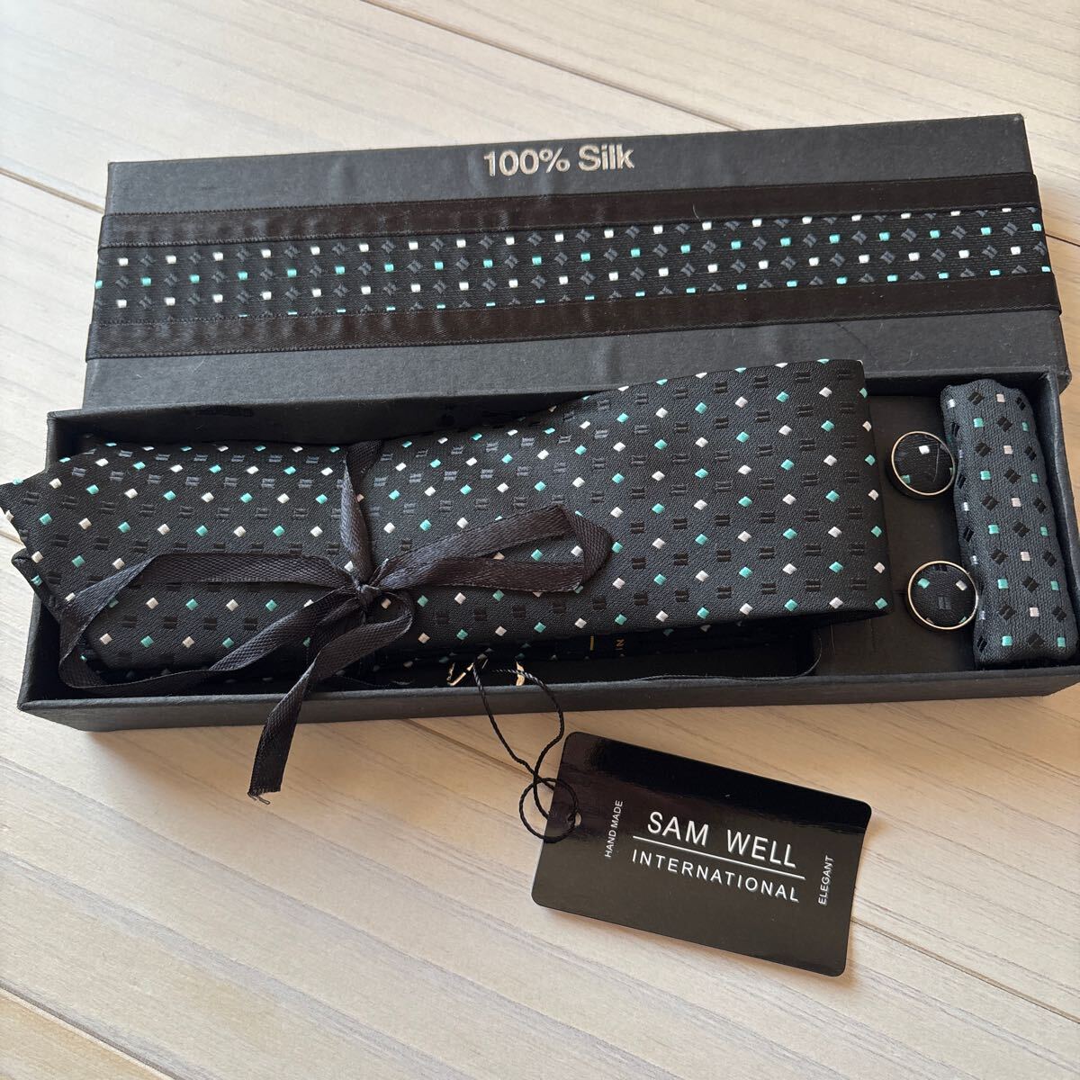ネクタイ タイピン カフスボタン ポケットチーフ 4点セット プレゼント用 ギフトボックス シルク100% 收藏