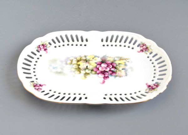 光を透す 高品質のBONE【スペシャル ボーンチャイナ 】穴あきレース 透かし 葡萄絵 金縁 金縁 21cm オーバルプレート 楕円皿 收藏