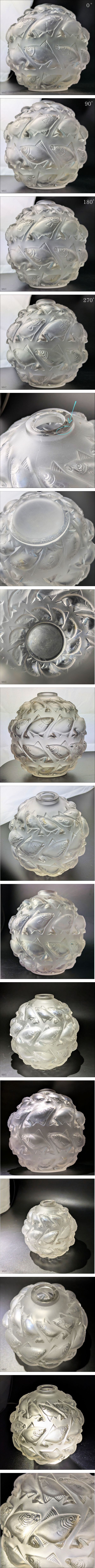| E1120/19 ◆返品承ります 万一お気に召さない場合、評価前なら返品お受けします ご安心してご検討下さい ◆ぜひ ⇒こちら もご覧ください。 価格のご相談などはプロフィール欄ご覧ください。 ◆お品物◆ ルネ・ラリック rene lalique カマレ camaret 魚群紋様花瓶 高さ:約14㎝ 1928年頃作品 ルネ・ラリックの代表的な作品のひとつ、「カマレ(Camaret)」です。 魚が全面に浮彫りで配された造形は、アール・デコ期に特徴的な力強いリズム感と流動性を備えており、1928年頃に制作されたモデルとして知られています。 繰り返される魚のモチーフは単なる装飾にとどまらず、水の循環や自然の力を象徴するかのようです。 光を受けた際の陰影の変化が非常に美しい仕上がりとなっています。 フロスト加工により立体感がより際立ち魅力を引き出しています。 そのため角度を変えるごとに異なる表情を見せてくれます。 状態については口縁部にわずかな小さなあたり、側面に細かい擦り傷がある程度で、全体としては丁寧に展示されていたと思われる稀有な良コンディションです。 製作からおよそ一世紀を経た作品として十分な保存状態を保っています。 画像をぜひご覧になってください 底部には「R. Lalique France」のサインが刻まれており、真正性が確認できる点も安心いただけます。 いわゆる入門的な作品ではございませんが、コレクターの皆様にはたいへん希少な一点ではないでしょうか。 甘美な花や女性像を描いたモデルに比べ、よりシャープで力強い印象を持つため、コレクションの中に確かなアクセントを加える存在になります。 この作品を所有することは、単に装飾品を手に入れるということではなく、アール・デコ期の精神とラリック芸術の精髄に触れる体験そのものです。 まず滅多に出品されることのない作品ですので長く出会いを待っていた方に、ぜひ手に取っていただきたい一作です。 | ||