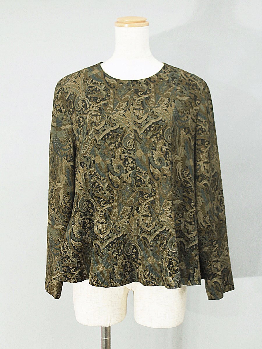 美品 詩仙堂 洗える/ちりめん織り総柄長袖ブラウスプルオーバー 黒カーキ an228 收藏