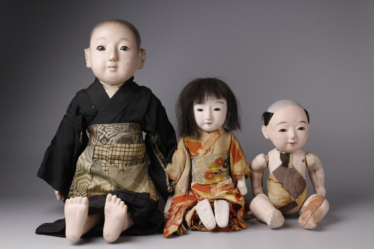 【LIG】時代市松人形 三体 玉眼 三盛抱茗荷紋付 日本人形 旧家蔵出品 ② [-WW]25.10 收藏