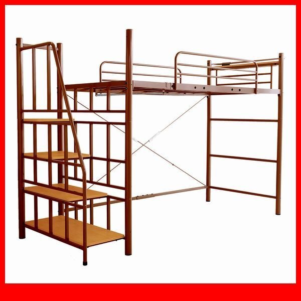 ベッド★階段付き ロフトベット シングル/宮棚 コンセント付き/ハイタイプミ ドルタイプ 高さ調整/極太パイプベッド/ブラウン/新品 即決/a3 收藏