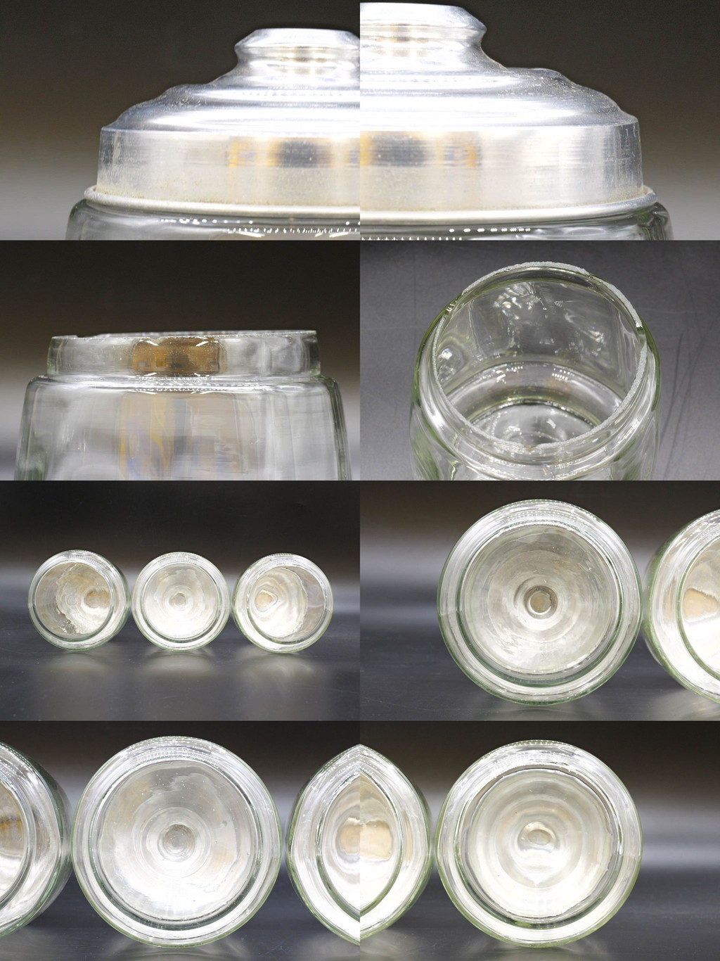 R-076438 昭和レトロ 当時物 大正~昭和初期 アルミ蓋 ガラス瓶3個セット(キャニスター、ガラスビン、硝子、菓子瓶、フタ付き) 收藏