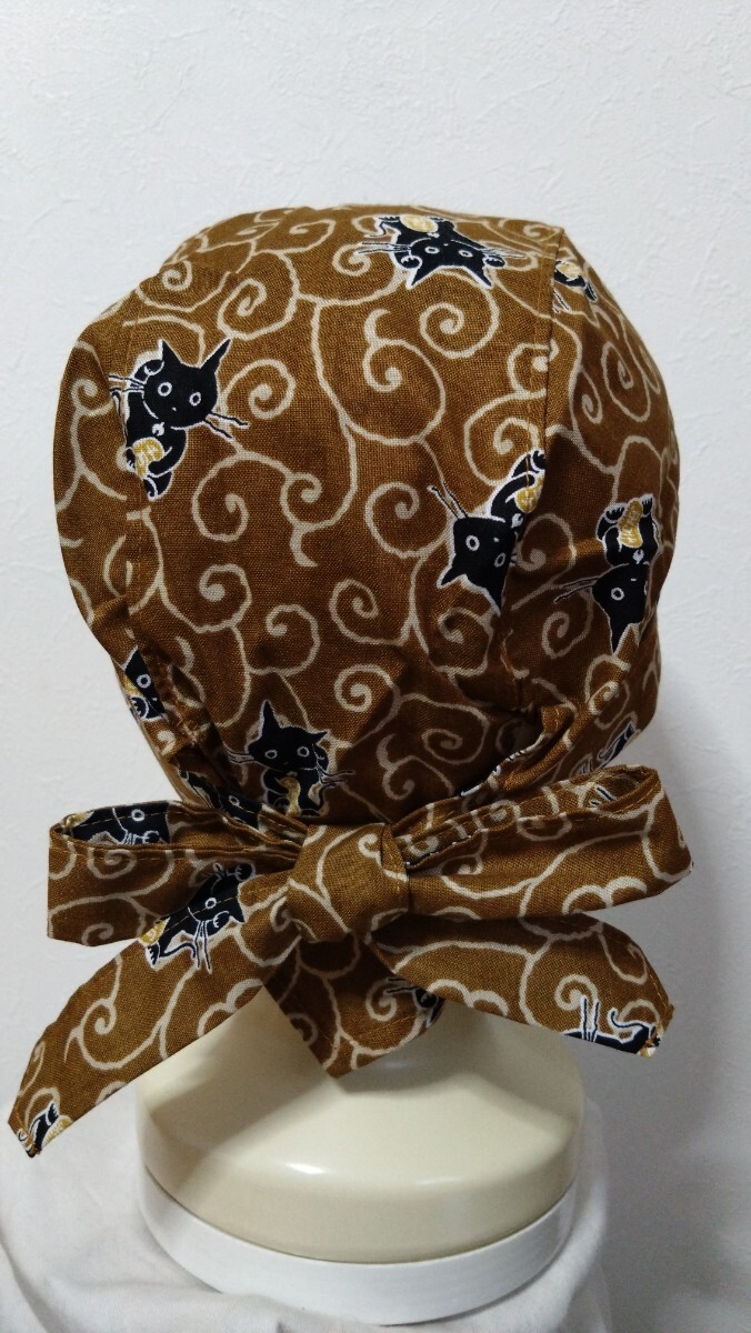 短★バンダナキャップ★ハンドメイド 和柄 唐草&黒ネコ 茶 收藏