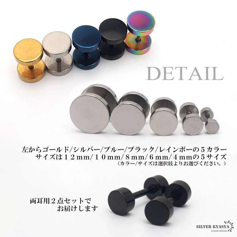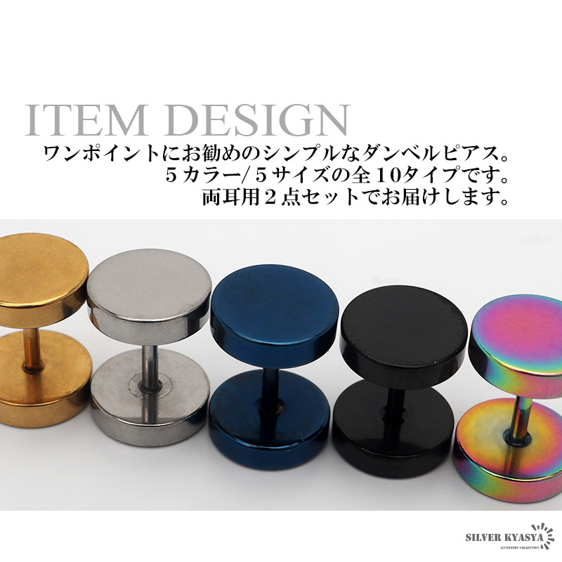 (レインボー、10mm) ステンレス スタッドピアス ダンベル ゴールド シルバー ブルー ブラック レインボー 両耳用 2点 收藏