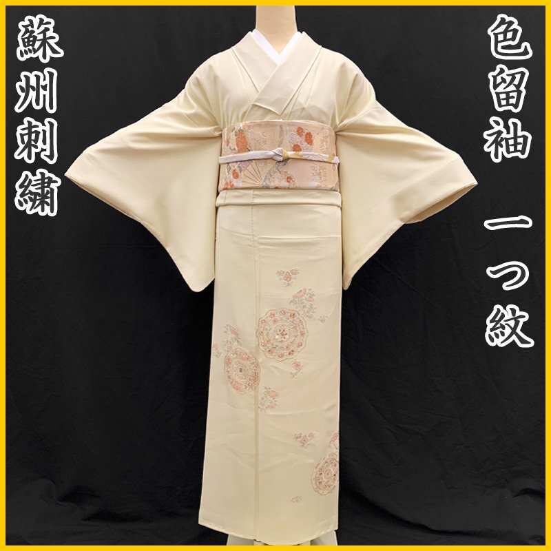 〇きものマーチ〇色留袖 一つ紋 刺繍 蘇州刺繍 宝相華 花 薄い黄色〇状態良好 503mo10 收藏
