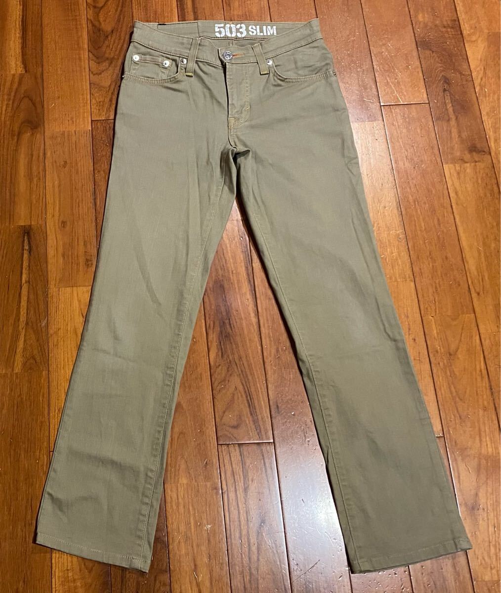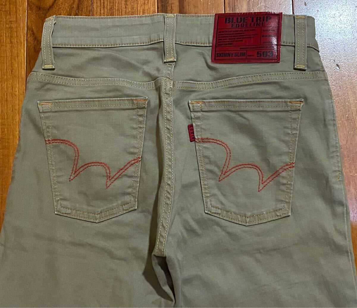 エドウィンのストレッチデニムパンツ、EDGELINE SKINNY SLIM EG5032です。色はカーキです。USEDで裾直ししておりますが状態は良いです(10段階中8程度)。生地はストレッチ入りで綿98%、ポリウレタン2%です。ジッパーフライです。正規品です((株)エドウイン、日本製)。サイズはW27でウエストは重ねずに平置きで約76cm、ヒップ約94cm、股上約23cm、股下約74cm、股下15cmのふともも部分約47cm、裾まわり約38cm、重量約500gです。発送はゆうパケットポストになります。