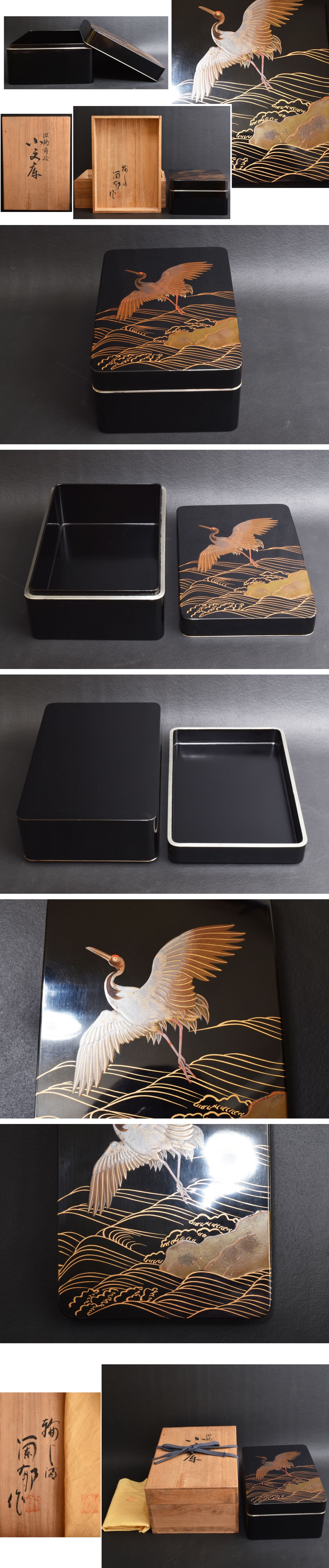 5780 輪島塗 文庫 波鶴蒔絵 銀縁 小文庫 共箱 收藏