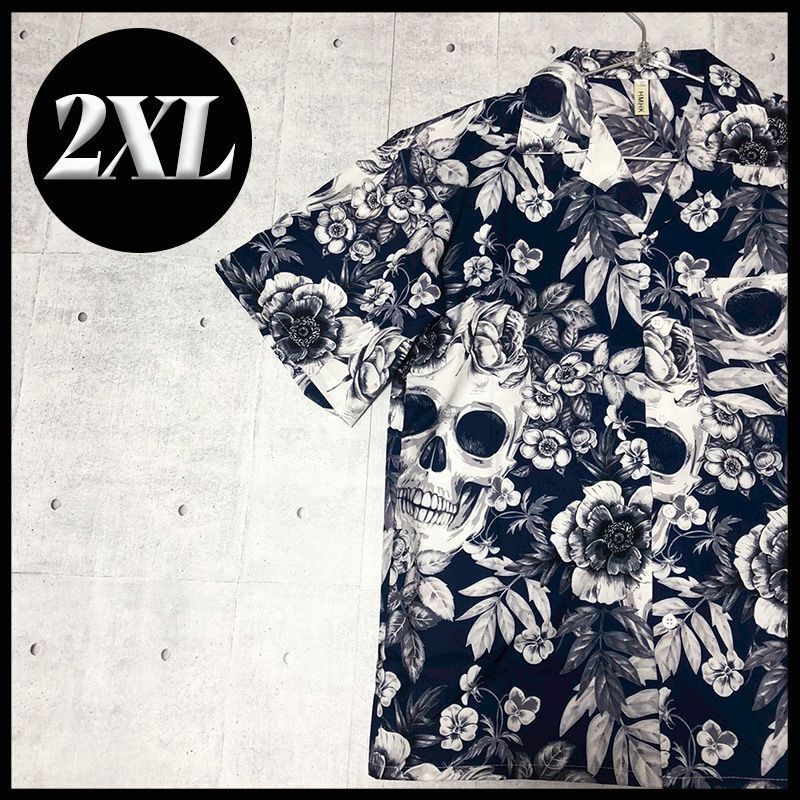 2XL半袖シャツ ドクロ髑髏ボタニカル ゆったりネイビー総柄カジュアルアロハシャツ おしゃれ アート デザイン個性派リゾート旅行ストリート 收藏