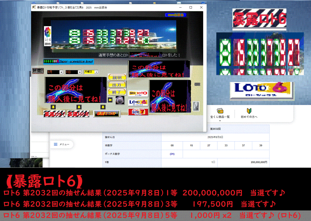 ロト6 第2032回の抽せん結果(2025年9月8日)1等 200,000,000円 当選です♪ (暴露ロト6)