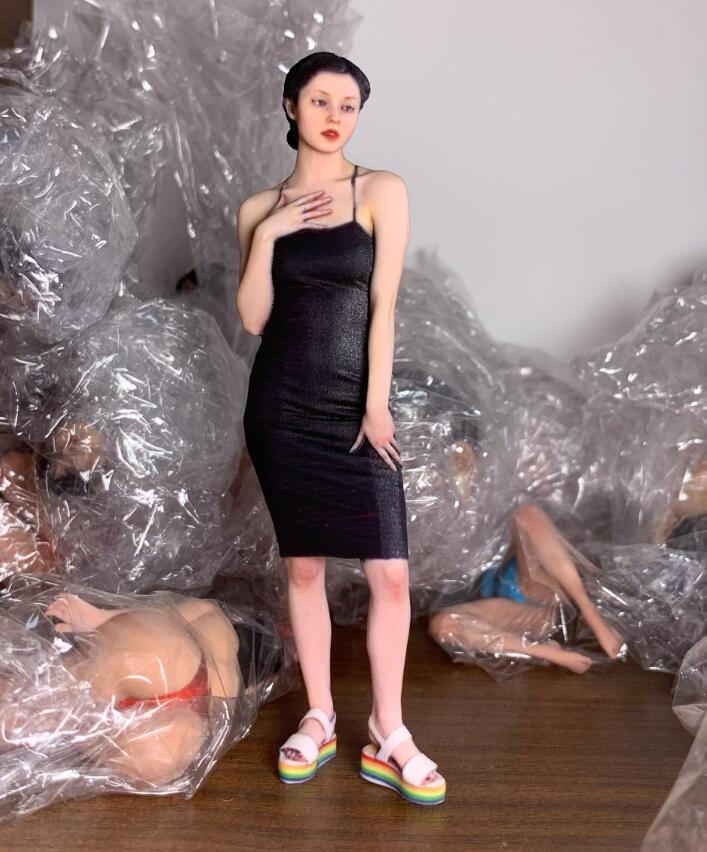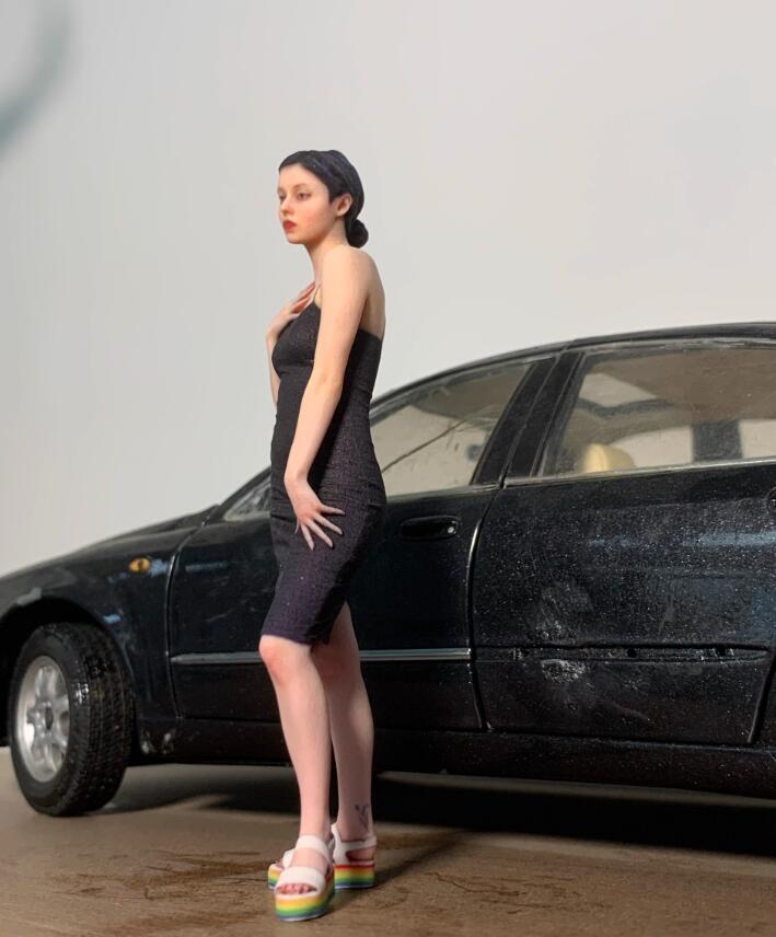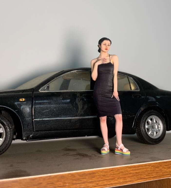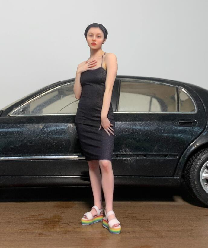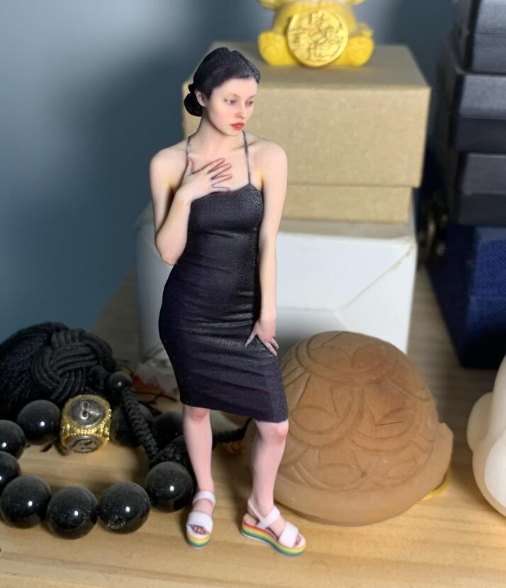 上質 【塗装済み完成品】1/18サイズ 超写実 黒ドレス少女像 ミニチュアレジン彫刻 机の上飾り フィギュア 收藏
