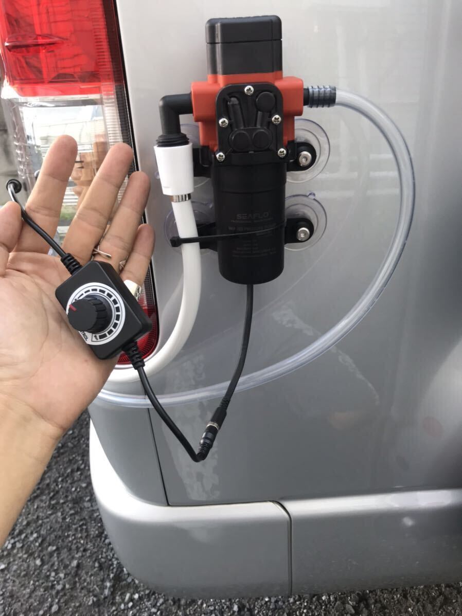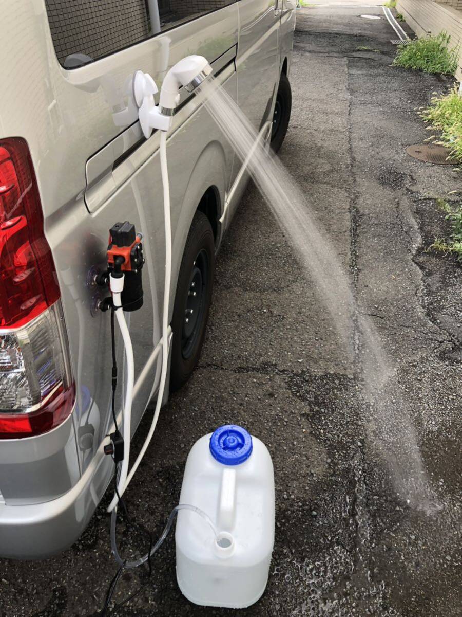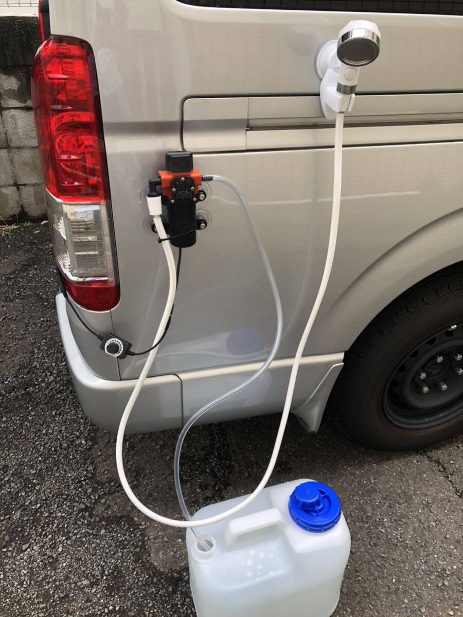タンク内の水を電磁ポンプで水を吸い上げ、シャワーヘッドから出す簡易シャワーです。