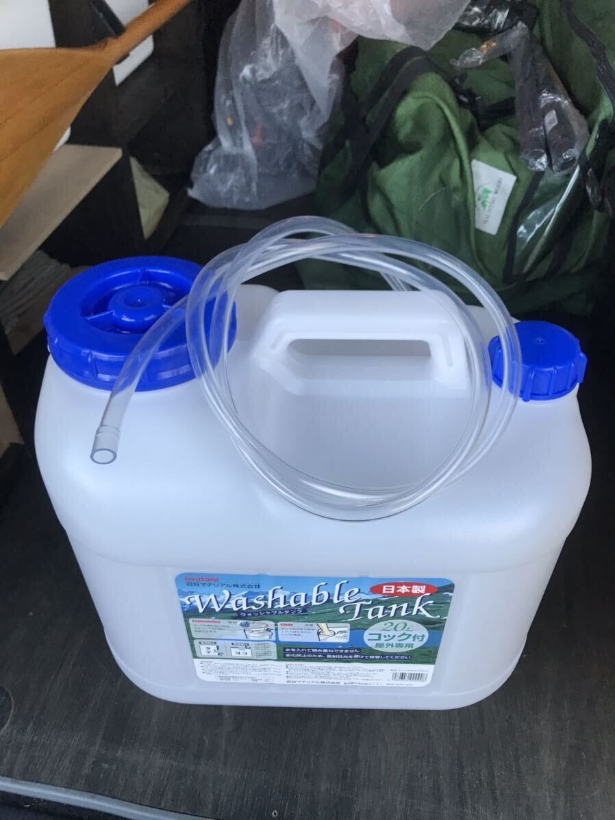 *ホームセンターアウトドア用品コーナー20Lタンク+園芸コーナー汎用ホース1m(内径10φ)で計1,000円ほどです。