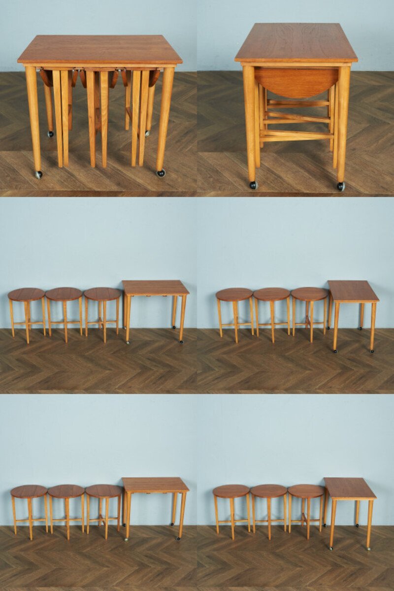当時活躍したデンマーク人デザイナーPoul Hundevad(ポール・ハンデバッド)が、旧チェコスロバキアのNovy Domov社により発表した、ヴィンテージネストテーブルです。 キャスター付きテーブルの下に、折りたたみの小さいラウンドテーブルを複数収納している変則タイプのユニークなデザイン。市場でもかなり希少なお品です。 用途に合わせて引き出したり、纏めたりできるとても便利な入子構造のネストテーブル。リビングのサイドテーブルや寝室に置くナイトテーブルとして、フレキシブルにお使い頂けます。 |