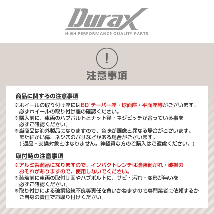 | 鍛造アルミ ホイールナットです♪ アルミ鍛造を使用し、アルマイト仕上げで、とても軽量です! ホイールナットの軽量化だけではなく、 今お乗りの純正ナットをホイールナットに替えるだけで手軽にドレスアップできます! ■商品コード:BBP125BS ■商品仕様 カラー:ブラック 素材:アルミ鍛造 表面処理:アルマイト仕様 座面:60度テーパー 全長:34mm ネジピッチ:M12×P1.25 ローレット加工 新品未使用 ■内容 ナット ×16 ロックナット ×4 ロックナットソケット ×1 ■注意事項 ・アルミ製商品によりインパクトレンチは塗装剥がれ・破損のおそれがありますので、使用しないでください。 ・ホイールの取り付け座には60°テーパー座・球面座・平面座等がございます。 必ずホイールの取り付け座の確認をして下さい。 ・装着前に車両の取付け面やハブボルトに、サビ・汚れ・変形が無いことを確認して下さい。 ・車両のハブボルトとナット径・ネジピッチが合っている事を確認して下さい。 ・センターカバータイプのホイールには装着出来ない場合がありますのでご注意下さい。 ・入荷時期によって色味が画像と異なる場合がありますのでご了承ください。(返品・交換対象外です) ■保障期間 7日間 ※商品到着後7日以内の初期不良・破損のみご対応させていただきます。 【新品未使用品です】 ▼検索ワード ホイールナット レーシングナット 袋ナット 缶ナット 貫通ナット ショートタイプ ロングタイプ ロックナット 軽量 純正 ナット ホイール タイヤ 4穴 5穴 アルミ 盗難防止 |