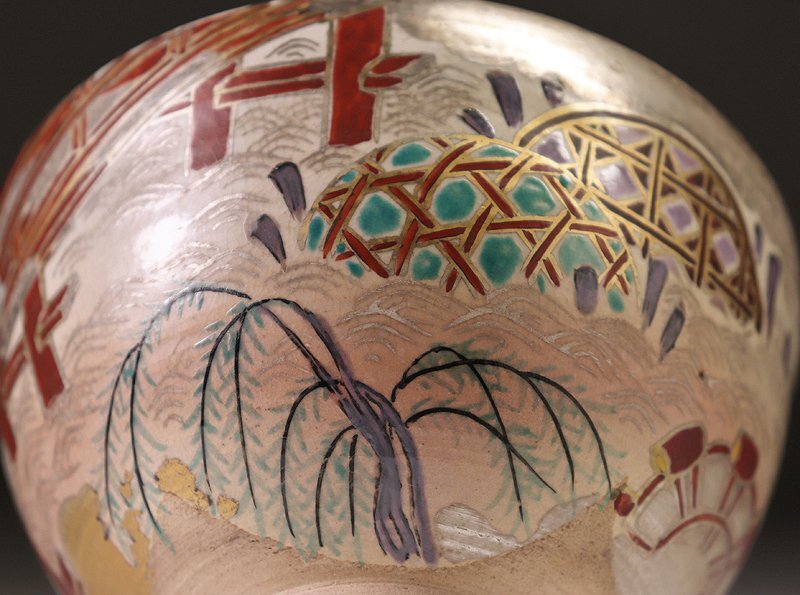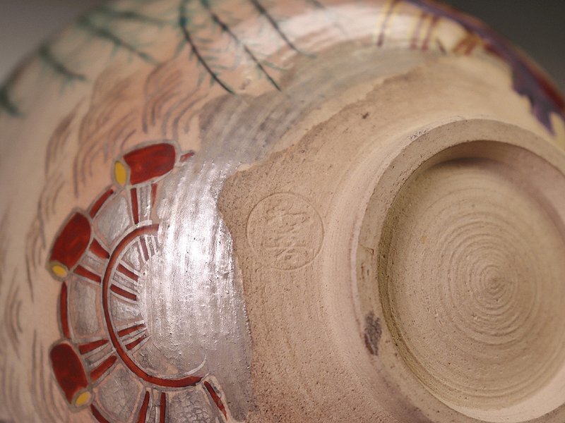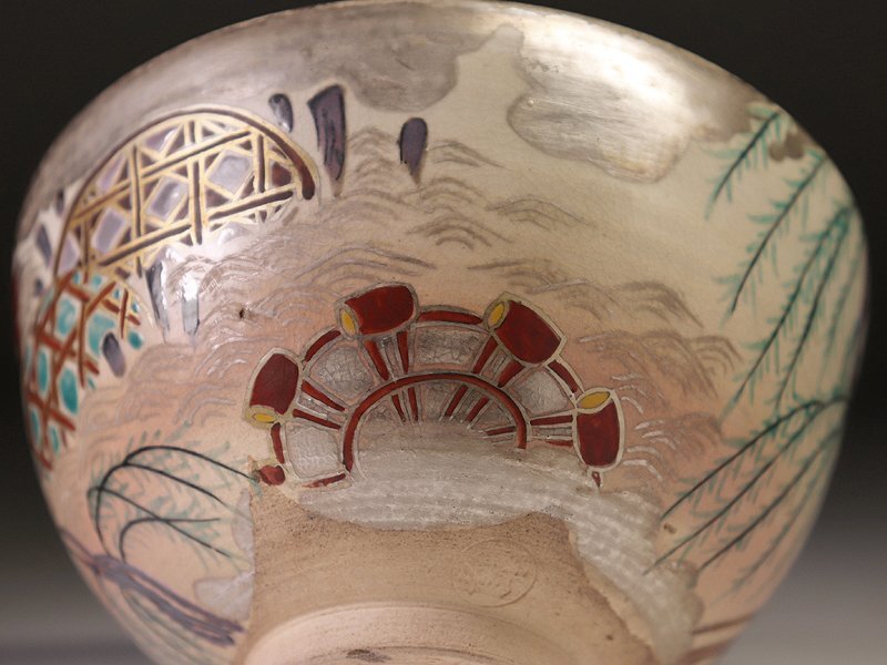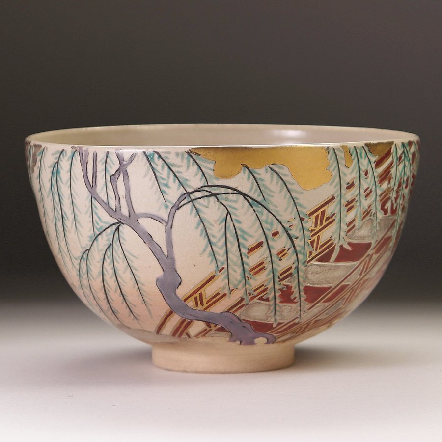 ∇花∇【北村和善】作 御室焼色絵茶碗「や奈記ば志(柳橋)」 共箱付 仁清 收藏
