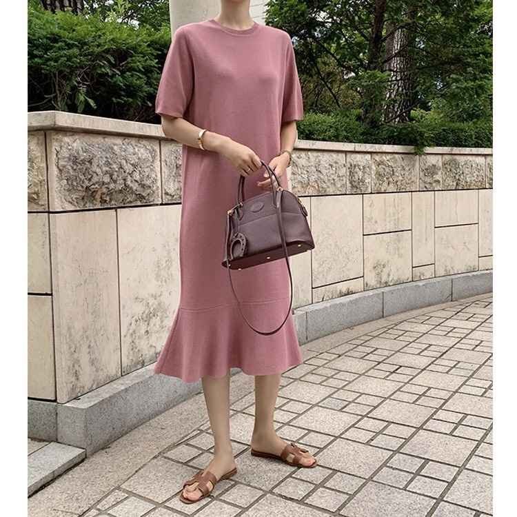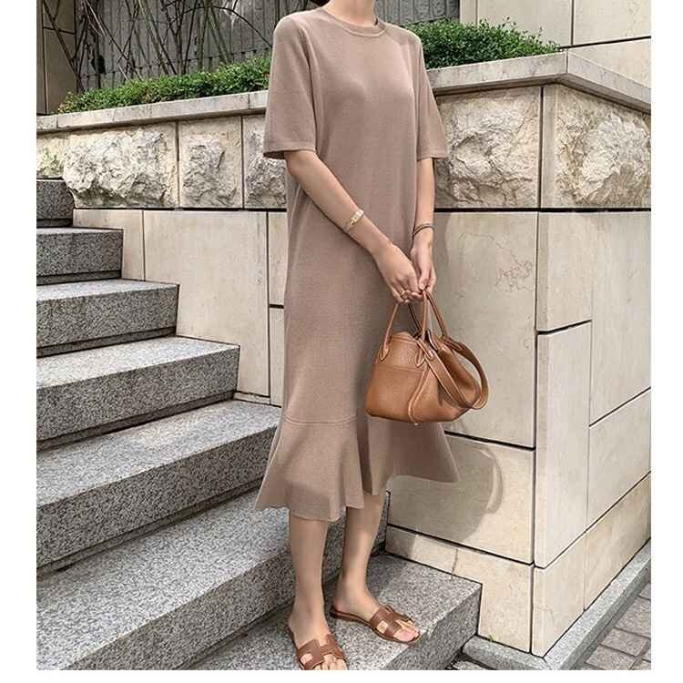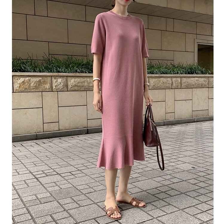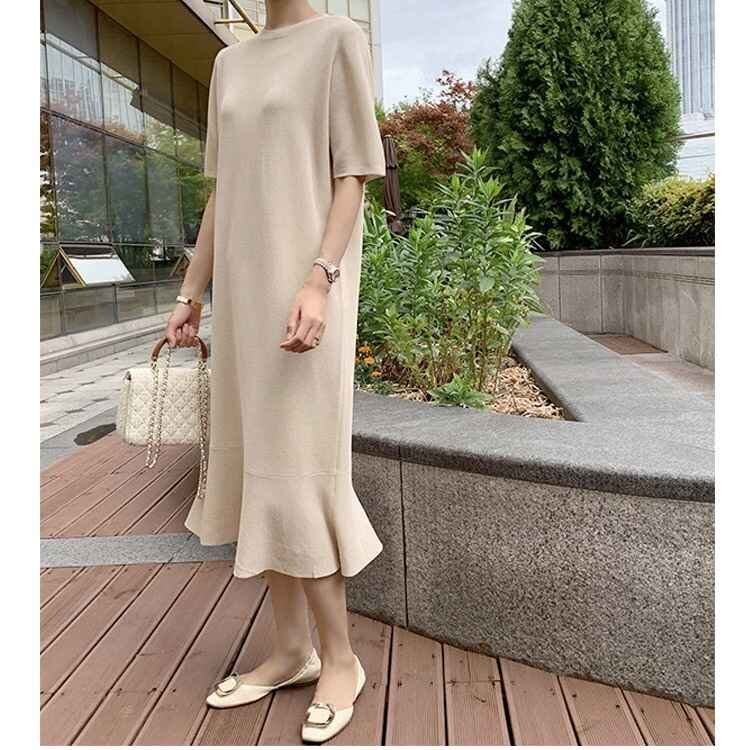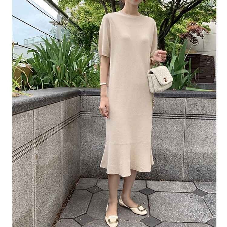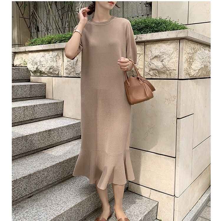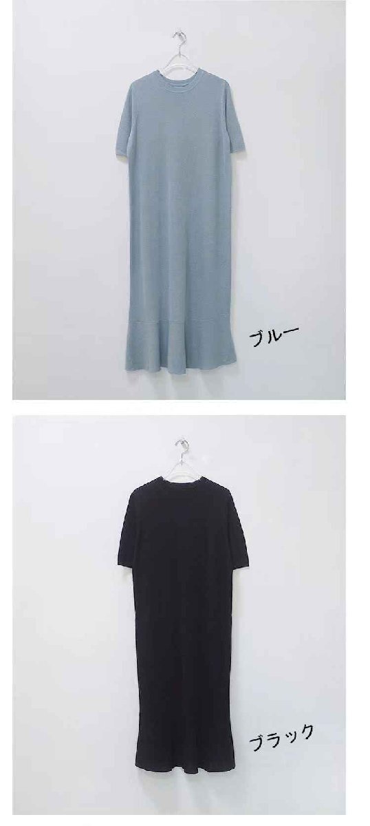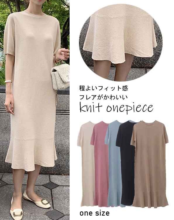 春夏 レディース 大人可愛い ロング ニット フレア ワンピース 体系カバー 半袖 通勤通学 日常 フリー ラテ 收藏