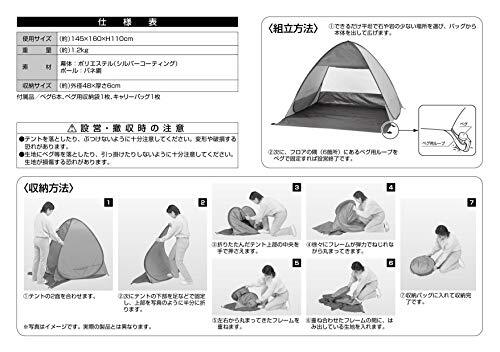 「商品情報」商品紹介使用サイズ:(約)145×160×H110cm収納サイズ:(約)外径48×厚さ6cm製品重量:(約)1.2kg付属品:ペグ6本、ペグ用収納袋1枚、キャリーバッグ1枚材質:幕体/ポリエステル(シルバーコーティング)、ポール/バネ鋼原産国:中国パッと広がるポップアップテント。シルバーコーティングで夏の日差し、紫外線を防ぎます。ビーチやピクニックはもちろん、アウトドアフィールドでも活躍。テントの広さ約1.4畳。2人用。テント奥行120cmテント後面にメッシュを装備。通気性と開放感がアップ。テント内両サイドに小物入れに便利なメッシュポケット付き。持ち運びに便利なキャリーバッグ付き。安全警告ポップアップテントの設置、使用、収納の際は十分ご注意ください。「主な仕様」使用サイズ:(約)145×160×H110cm収納サイズ:(約)外径48×厚さ6cm製品重量:(約)1.2kg付属品:ペグ6本、ペグ用収納袋1枚、キャリーバッグ1枚材質:幕体/ポリエステル(シルバーコーティング)、ポール/バネ鋼、原産国:中国