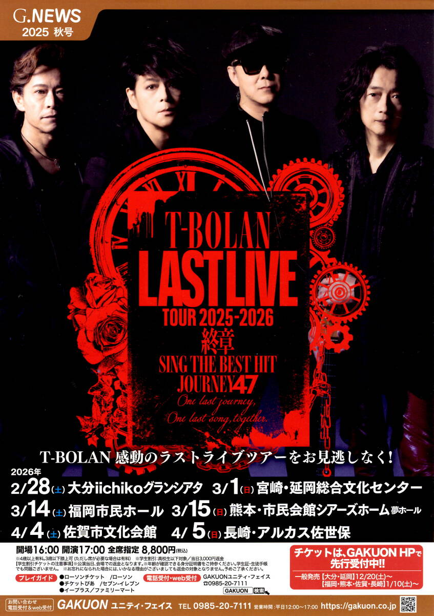 送料無料 5部 表紙 T-BOLAN LASTLIVE TOUR 2025-2026 終章 九州地区告知チラシ G.NEWS 收藏