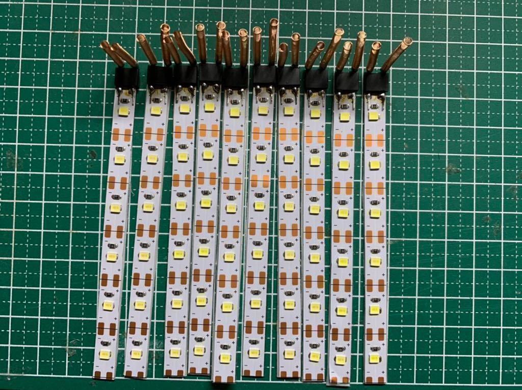 既存のテープLED室内灯を変更、改良し当方の所有車両で動作不良もないことから当オークション向けに製作し出品します。前回品同様に強度を確保するためテープLEDにプラ板を貼り付け3M製強力両面テープを使用していますのでしっかり取り付けられます。1本1本手作りのため数量限定です。なお、点灯確認後出品しておりますが、素人製作のため細かい部分(ハンダ付けなど)はご容赦ください。1本あたりの長さはダイオード(黒色のもの)を含めて約10.8cmです。また1本あたりの消費電力は0.48wです。製品は1本あたり6個のLEDですが、取り付け車両に応じてカット可能となっています。6個LEDは中間車両、5個LEDは先頭車両と使い分けが可能です。長時間点灯(30分以上連続点灯すると、人肌程度の熱を持つ場合があります。模型自体に影響はありませんがご注意ください。)