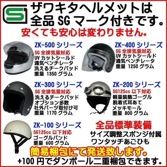 | コメント | おしゃれなセンターライン入りも選べるダックテールヘルメット! この価格なら予備用やタンデム用に大活躍できます。 もちろん、メインヘルメットとして日々のご使用にも十ニ分に使えます。 ZK-100との違いはアクセントのメッキモールです。 |