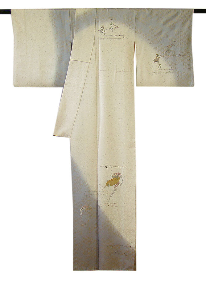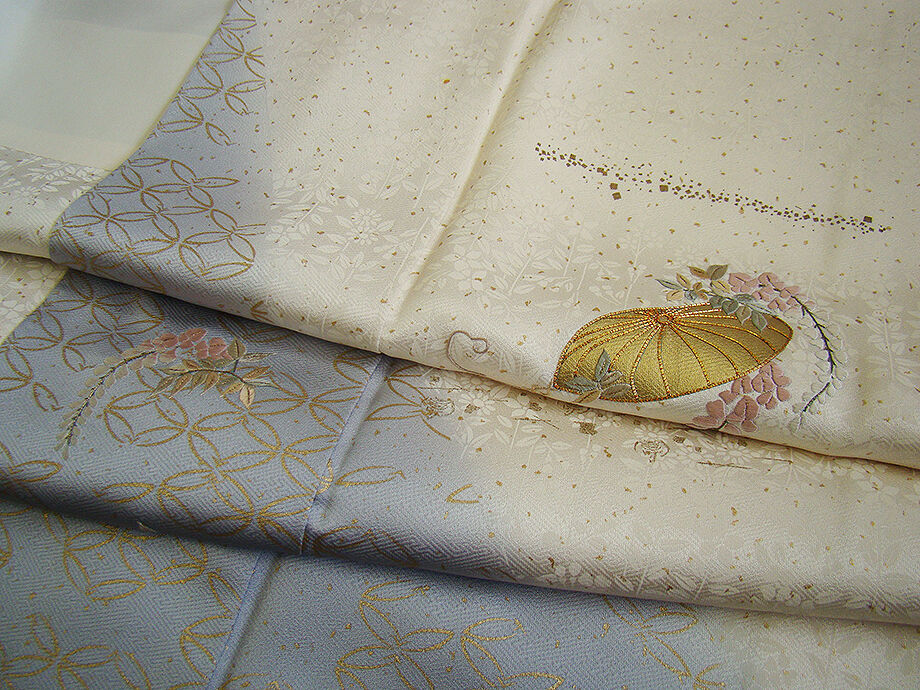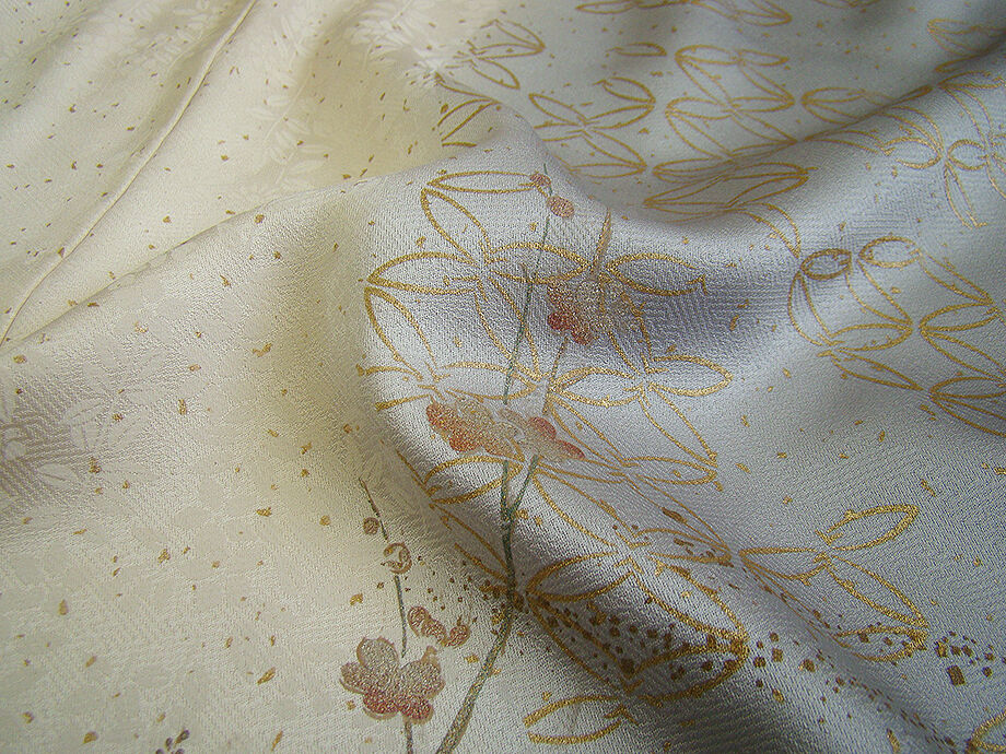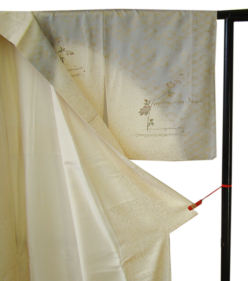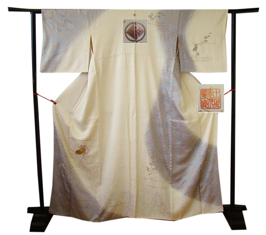 | 商品説明 | こちらのお品は「袷」ですので10月から5月までお召頂ければと思います。 しなやかな手触りの着心地良いさらりとした滑らかな重めの紋意匠地の生地、 象牙色地に裾にかけて灰色ぼかしに地模様入り、七宝文、花草柄の金彩加工染に刺繍入り、 気品に満ち溢れた彩りが正統派のお着物として一枚は欲しい逸品の素敵なお着物です。 共八掛(正絹)、背に刺繍紋1ヶ、作家の落款入り、幅広い年代の方にお召頂けます。 |