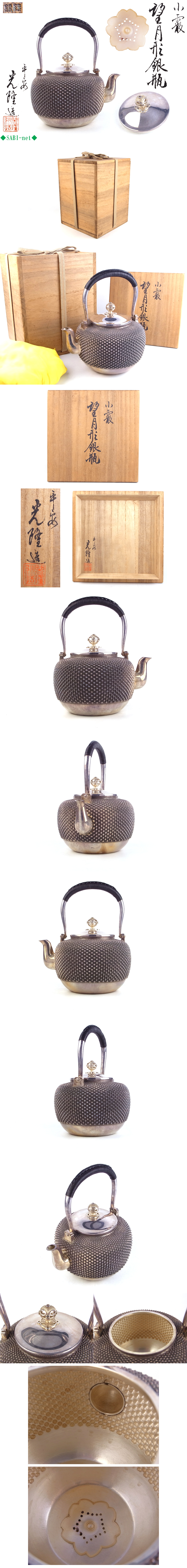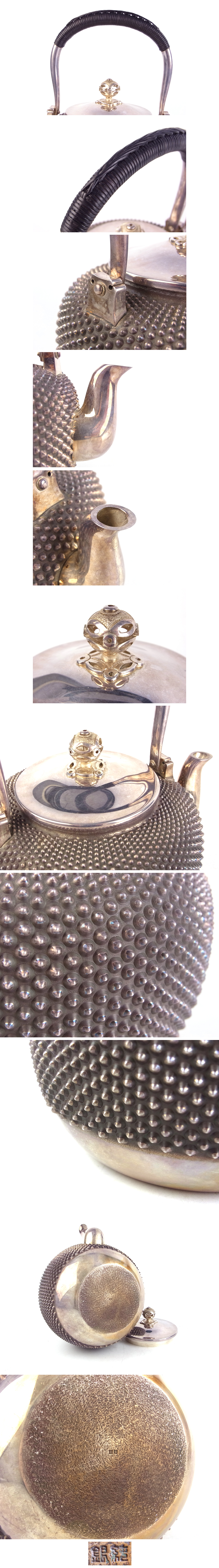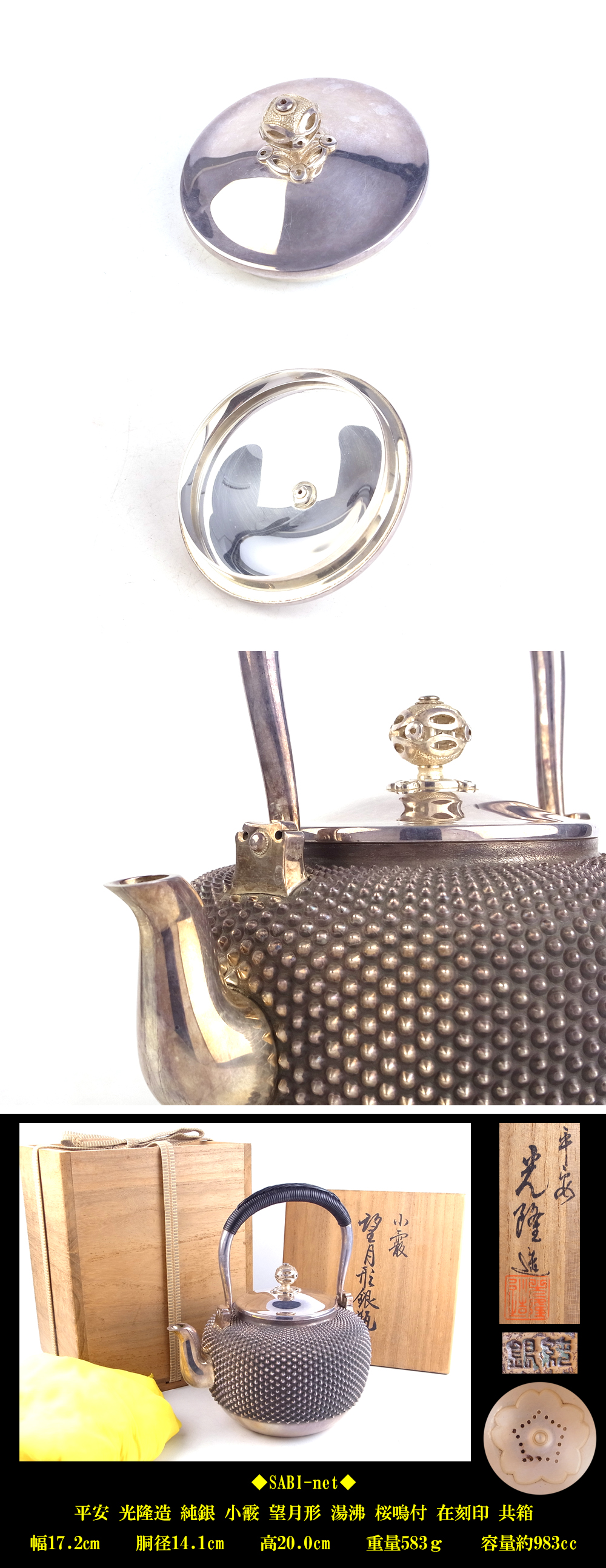 ◆SABI◆ 平安 光隆 造 純銀 小霰 望月形 湯沸 桜鳴付 在刻印 共箱 重量583g 容量約983cc◆ 煎茶 銀瓶 南鐐 霰 七宝透摘 收藏