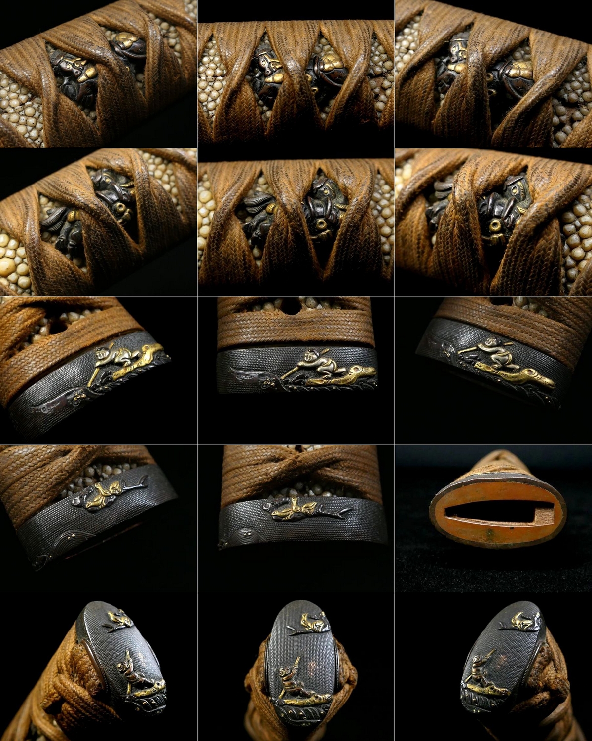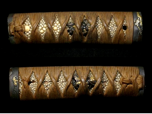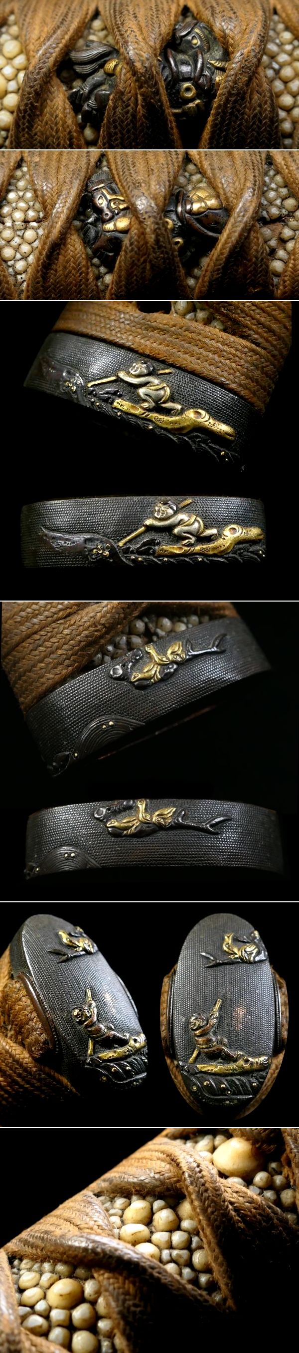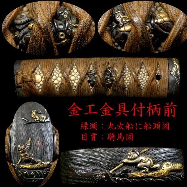 【 恵 #2030 】 金工金具付柄前 縁頭:水戸系統の優品 丸太船に船頭図 目貫:後藤系統の優品 騎馬図 粒の大きな親鮫有 検:刀剣/刀装具 收藏