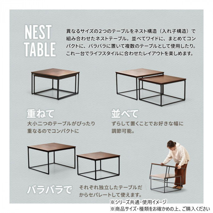 | 大小それぞれ分かれたテーブルです。使い勝手が良く、フレキシブルに使えるネストテーブル。大小のテーブルをうまくおしゃれに並べてリビングのセンターテーブルとして、重ねてソファ横の大きめのサイドテーブルや、大小を別々に使って自由にアレンジができます。 ※北海道・沖縄県・離島は別途送料発生いたします。 ※商品出荷後のキャンセルにつきましては、キャンセル料が発生いたします。キャンセルの場合は出荷前に早期ご連絡をお願いいたします。 |