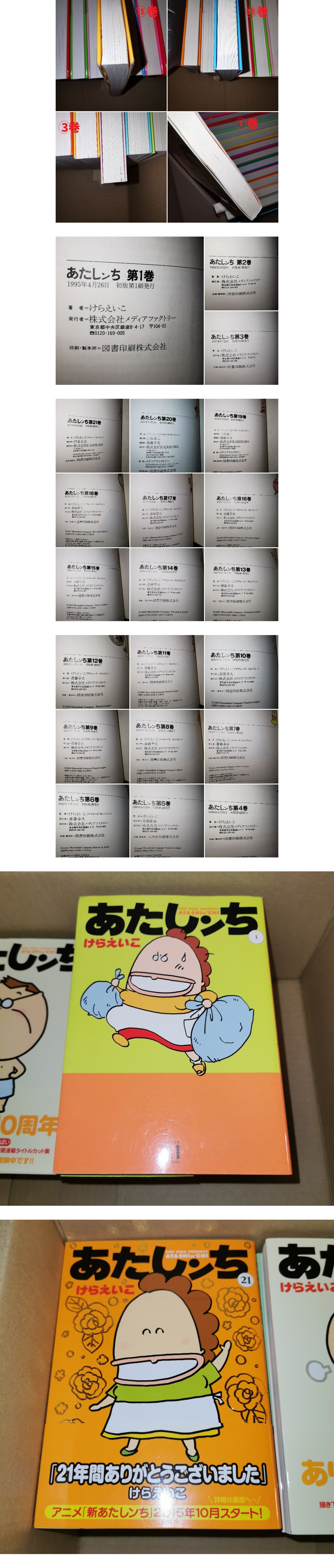 | ☆ご覧いただきましてありがとうございます☆ ■商品説明 ★全巻初版★ あたしンち 全21巻セット◆けらえいこ 漫画 コミック 帯多数 ハガキ・チラシ・栞付 書庫保管品 状態良好◎稀少 けらえいこ先生による人気漫画『あたしンち』、全1~21巻セットでの出品です。 こちらは大変貴重な【全巻初版】揃いとなっております。 巻数が揃っているだけでなく、帯・ハガキ・チラシ・栞などの付属品も複数残っており、通常の読本セットとしてはもちろん、コレクション向けとしても魅力のある内容です。 書庫保管品のため保管環境も比較的良く、年代を踏まえると全体的に状態はしっかりしている印象です。 ■付属・特記事項 ・全21巻揃い ・全巻初版 ・帯付:8、10~21巻 ・ハガキ付:1、4、5、6、10、11、12、13、15、16、17、18、19、20、21巻 ・チラシ付:11、12、15、16、17、21巻 ・栞付:9巻 ■商品状態 ・薄いヤケの見られる巻があります ・6巻は天の小口側にページ傷みがあります ・3巻、15巻、19巻に若干の角傷みがあります ・1巻の天に数ヶ所の点シミがあります ・そのほか、年代相応の軽微なスレ・小傷等はご容赦ください ・24時間空調の書庫にて保管していた品です ・主観では古本臭はあまり感じません 主だった傷みは記載しておりますが、細部の見落としがある場合もございます。 状態の感じ方には個人差がありますので、あくまで中古本としてご理解のうえご検討ください。 ☆彡 全巻初版でここまでまとまった『あたしンち』セットは希少かと思います。 お探しだった方、この機会にぜひご検討ください。 ・中古品のため、状態に神経質な方は入札をお控えください ・出品物は画像に写っているものがすべてです(撮影用スタンド等は含みません)。 ・写真の色合いはご覧の環境によって実物と異なる場合があります。 ■お 取 引 方 法 / 条 件 ・取引ナビでのお取引となります。 ・落札後48時間以内に取引ナビにて取引開始がない、または連絡が取れない方は落札様都合で削除する場合があります。 ・評価数が少なくてキャンセル履歴、悪評価の多い方の入札はご遠慮お願いいたします。 ・大変申し訳ありませんがトラブル防止のため、新規IDの方は入札前に質問欄よりご連絡下さい。 (ご連絡いただけない新規IDの方は削除させて頂く場合があります) ・個人出品につき、消費税はかかりません。 ・お荷物が到着しましたら、中身をご確認の上、「受け取り連絡」をお願い致します。 ■発 送 方 法 ・ゆうパック(追跡番号あり) ☆配送の梱包は基本的に再利用資材が多いですが、しっかり丁寧な梱包を心がけています。 ■ お支 払 方 法 ・ヤフーかんたん決済 ■備考 ※いたずら入札につきましては通報/評価も含め厳正に対処します。 ※個人出品につき、関係するトラブル、事故などに関して一切保障できませんので、 新品の状態や保証が必要な方の入札はお控えください。 ・過度に状態を気にされる方や、完璧をお求めになられる方の入札は、トラブルを避けるためにも入札を御控えいただきますようお願い申し上げます。 ・気になる点がございましたら入札前にお気軽にご質問下さい。 ・以上を踏まえノークレーム・ノーリターンにてお願いいたします。 | |