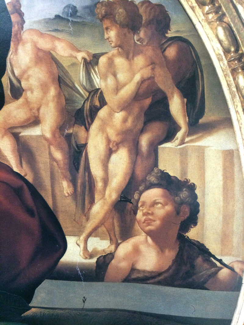 また、「トンド・ドニ」は彫刻としても考えられており、パネルの縦横のほぼ全体に渡って、グループのピラミッド型の構成が押し出されています。