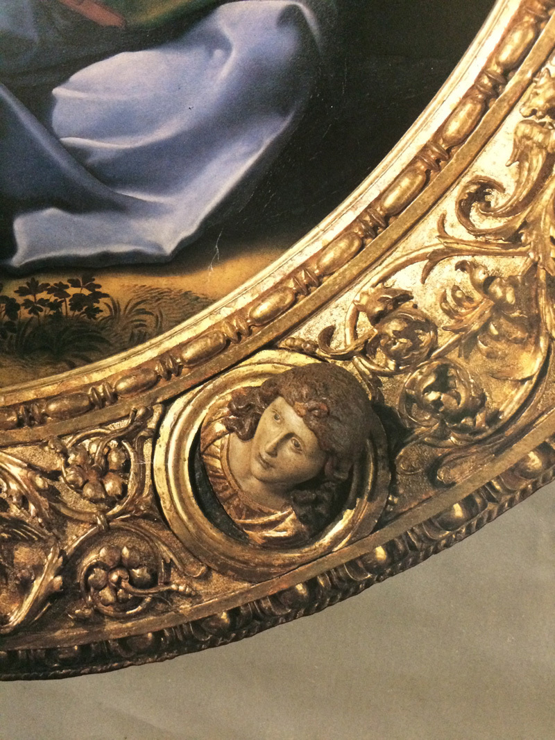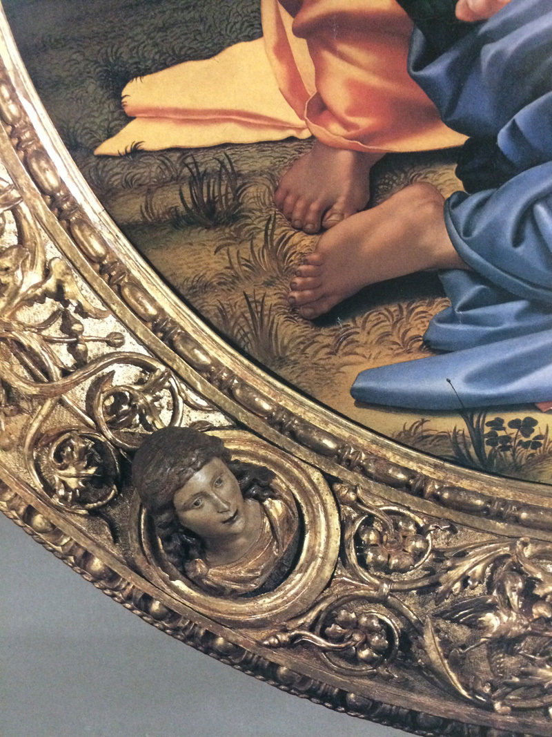 ミケランジェロがデザインしたと思われるトンドの枠は、フィレンツェの木彫の最高の伝統を受け継ぐフランチェスコ・デル・タッソが彫ったものです。