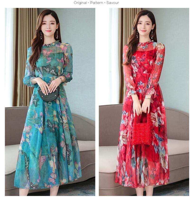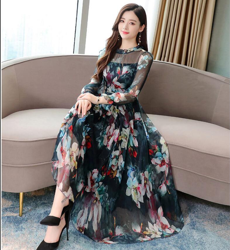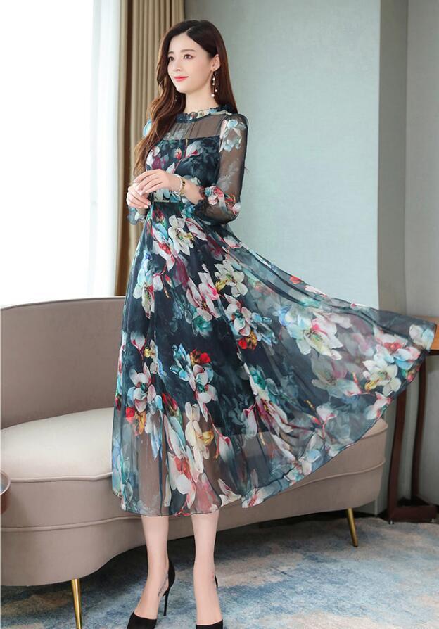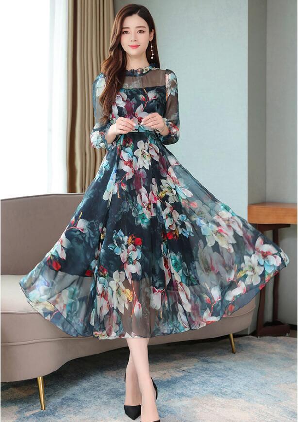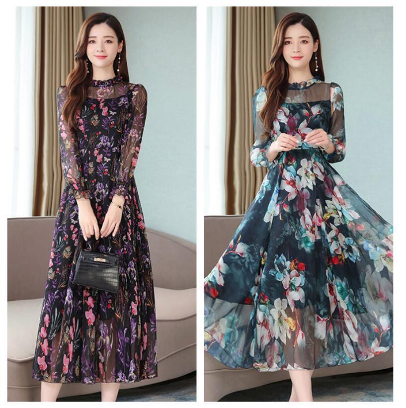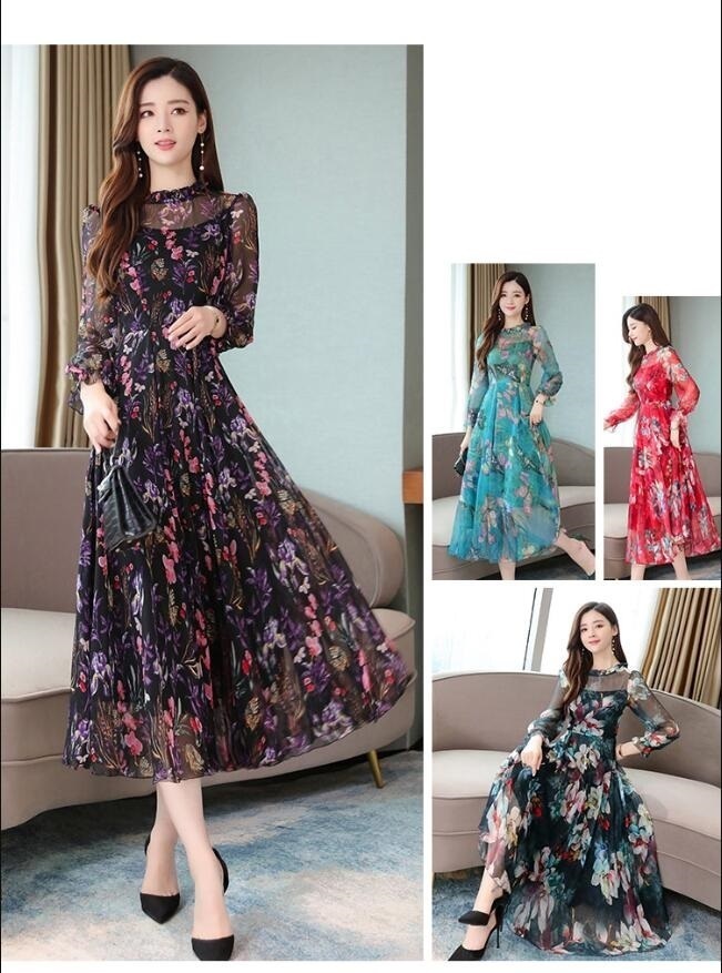 CHQ1013#大きいサイズ パープル 花柄 フリルスタンドカラー シフォン ロング ワンピース 收藏