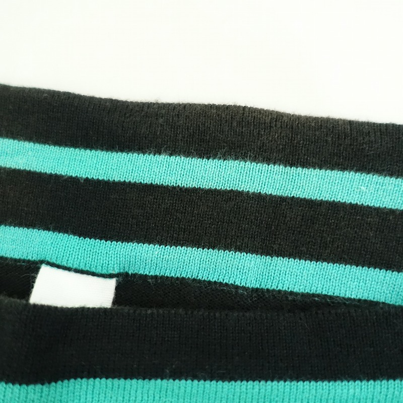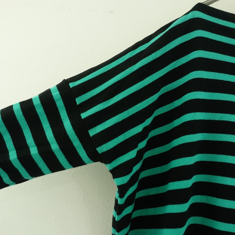 | G.F.G.S.のコットンボーダードロップショルダーワンピースです。カラーはブラック、グリーンのボーダーで、コットン素材で仕立てられています。ボートネックのプルオーバータイプで、ドロップショルダーデザインです。 |