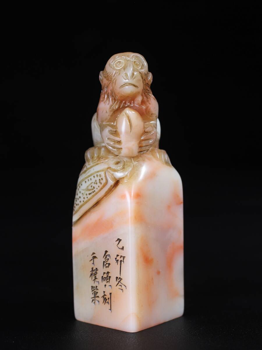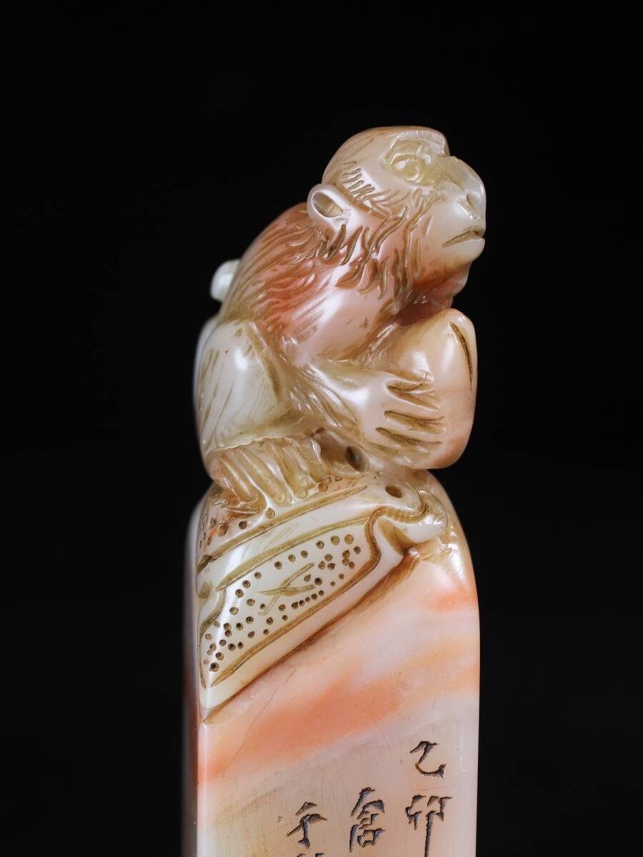 旧蔵 【猿が桃を捧げる 】 寿山石 彫刻 瑞獣 印鑑 古印材 天然石 純手彫 篆刻 極細工 希少珍品 中国古美術 古美味 fx715 收藏
