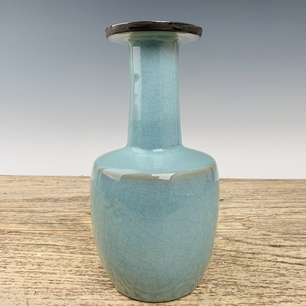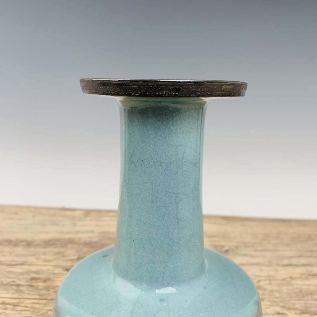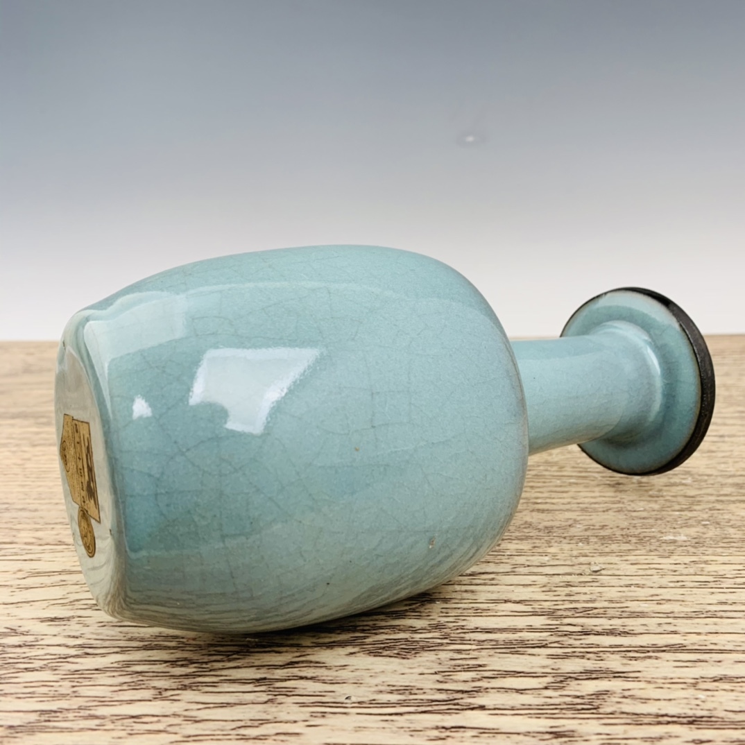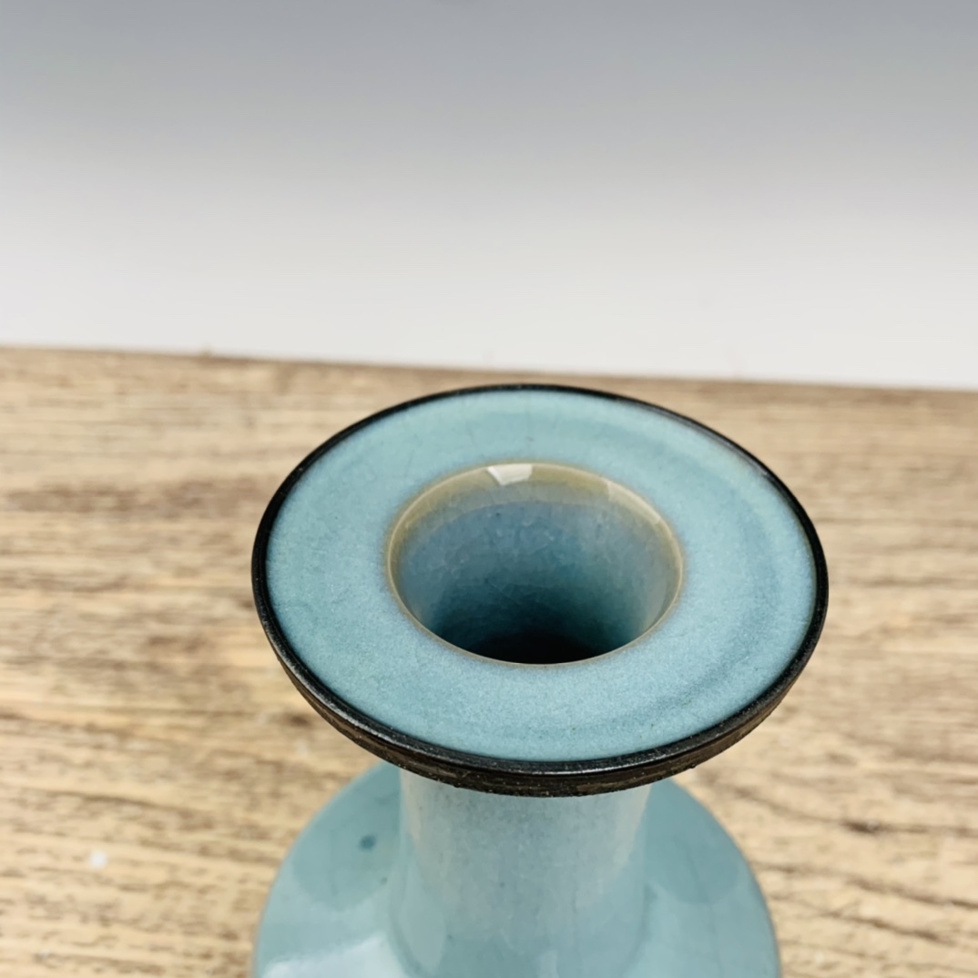 秘藏 宋時代 時代物 汝窯 天青釉盤口瓶唐物 陶磁器 共箱付き 古賞物 置物 中国美術 高さ22.5 cm、直径11 cm 古物保証 ly8.24 收藏