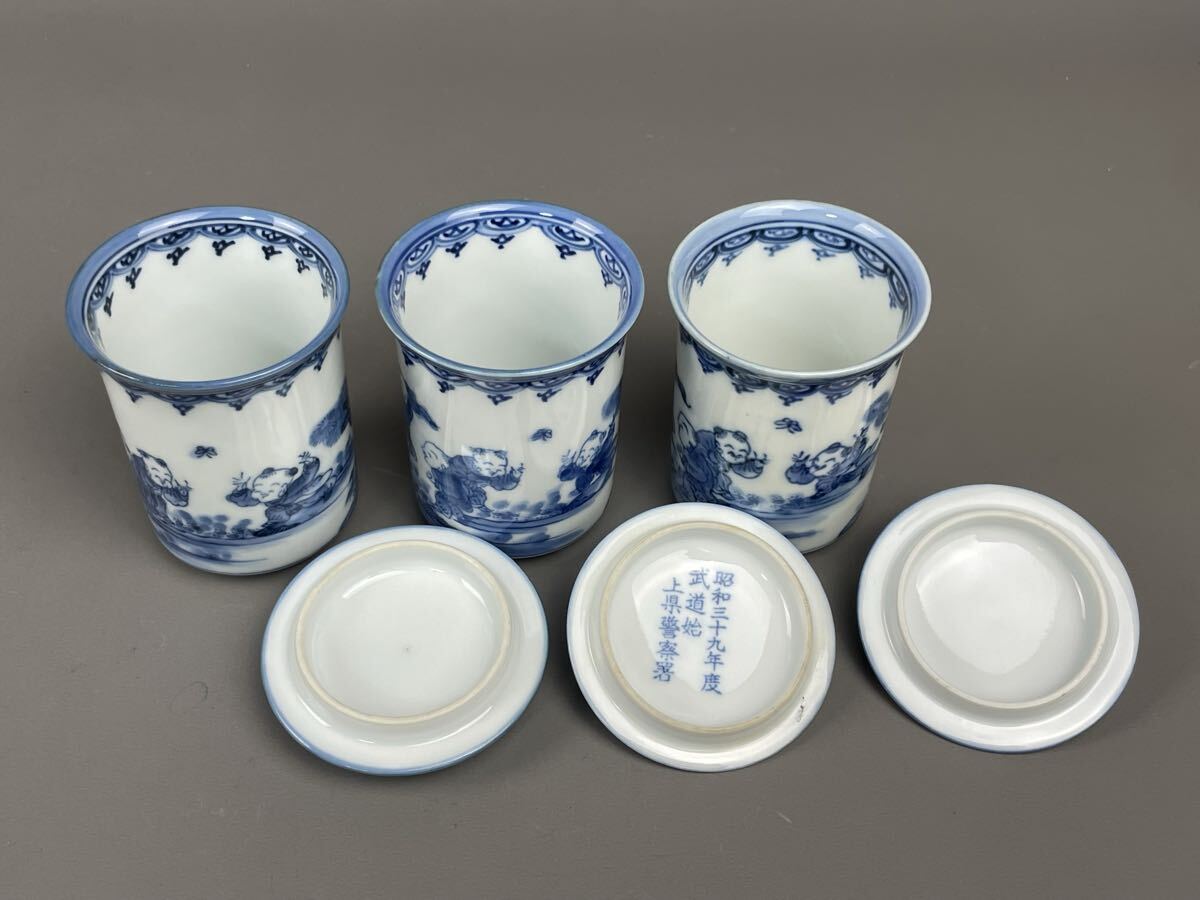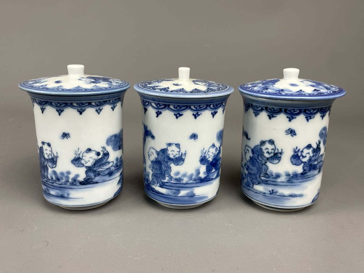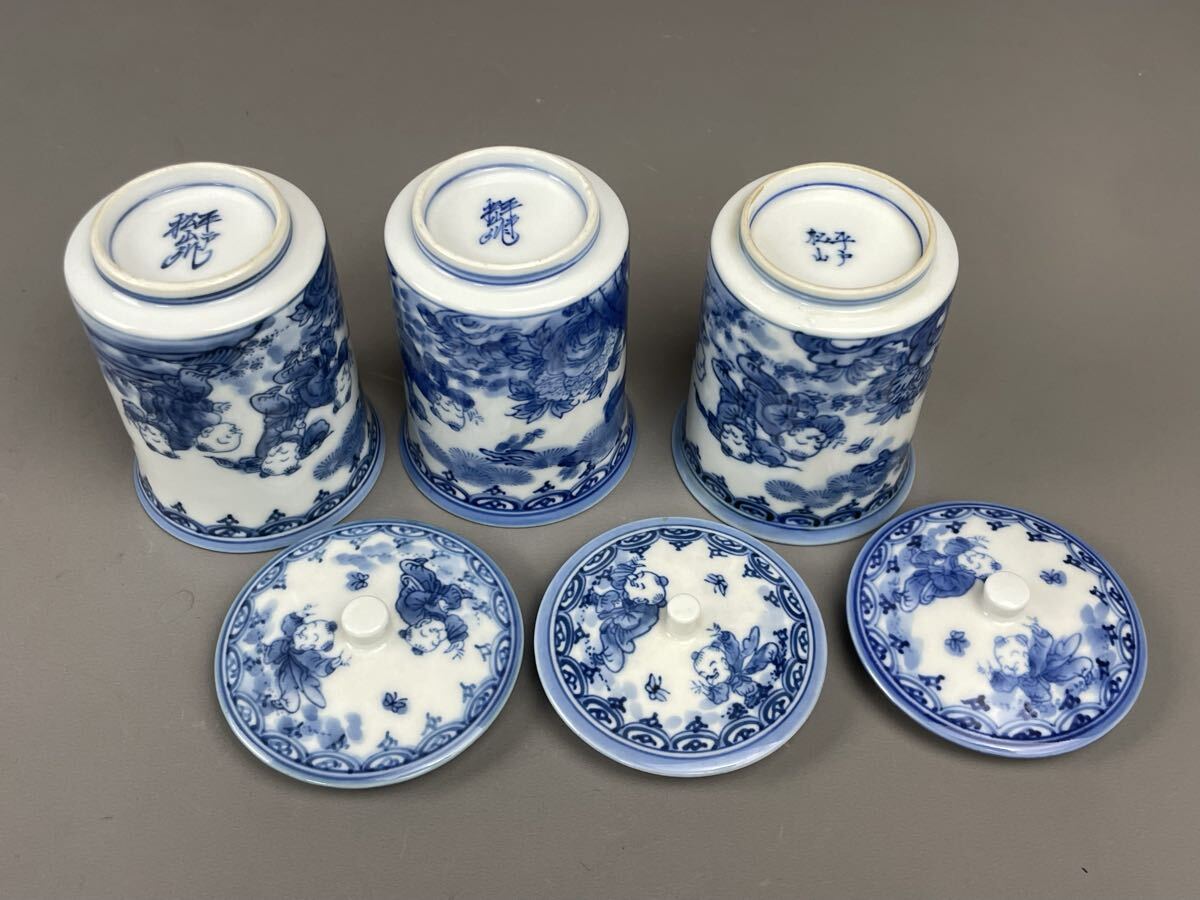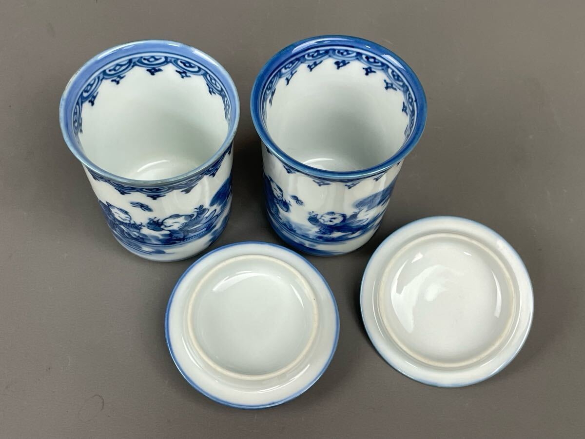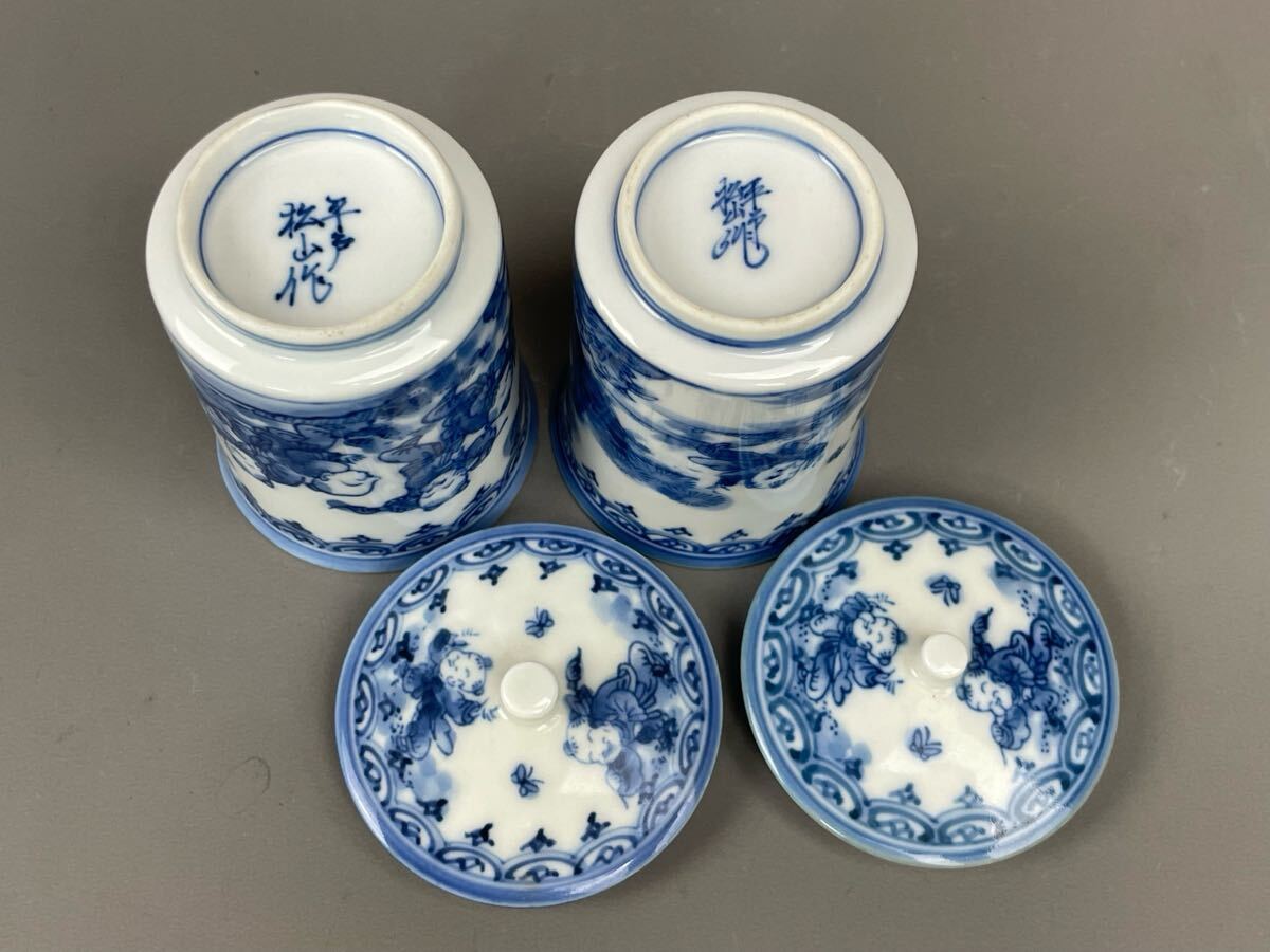 平戸 三川内焼 松山作 唐子 蓋付湯呑み 5客セット まとめ売り 夫婦 染付 有田焼 古伊万里 和食器 蓋物 收藏