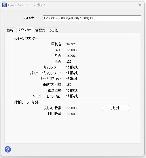 | 商品説明 | ご覧いただきありがとうございます。 自己紹介、商品説明、注意事項を必ずご確認のうえ、ご落札ください。 仕様などはこちらのメーカーサイトをご参照ください。 【外観】 ・使用に伴う小さな傷やホコリ、また一部に日焼けが見受けられます。 ・詳細は写真をご確認ください。 【動作確認環境】 ・Windows11 Pro 64bit/USB接続にて確認 【動作状況】 ・フラットベッドスキャン、ADFスキャンともに正常に動作することを確認しました。 ・PC接続も問題なく、スキャン品質も良好です。 ・USB接続にて動作確認済みです。 ・ファームウェアは最新バージョンにアップデート済みです。 ・最新のスキャンカウンターは以下の通りです。 - 原稿台(フラットベッド):34092枚 - ADF:170083枚 - 片面読み取り枚数:169961枚 ・給紙ローラーカウンター170083/耐用枚数100,000 【付属品】 ・USB 2.0接続ケーブル(非純正) ・ACケーブル(非純正) 【注意事項】 ・消耗品(ローラー等)の残耐用は保証外となります。 |