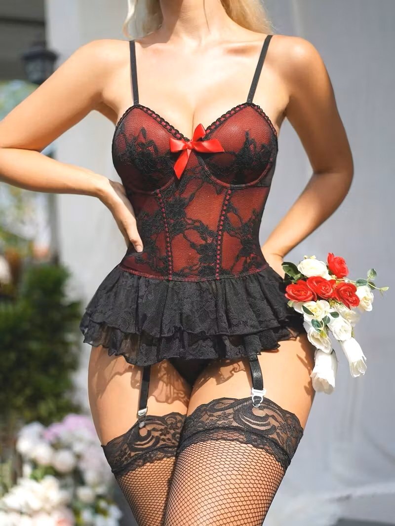 ◆ラグジュアリー美レース ボディースーツガーター付+ショーツ+靴下3点セット サイズ3L 赤・黒系 新品:大きいサイズ◆送料230円(匿名)◆ 收藏