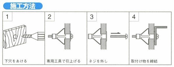 | 中空壁用・せっこうボード壁用 開脚式(カサ式)金属アンカー サイズ:54mm(全長)、60mm(ねじ長さ) 下穴径:Φ9mm 適応板厚:21~27mm 入数:120本 ※A-423、A-427はせっこうボード2枚張り対応です。 使用上の注意 ●天井には絶対に使用しないでください。 ●壁面の厚さを確認し、適応板厚範囲内でご使用ください。 ●ねじの締めすぎにご注意ください。 ●このアンカーは過度の開脚や開脚不足が原因で著しく強度が低下します。 ●施工時には安全めがね・安全保護具等を必ず着用してください。 使用にあたって ●インパクトドライバーでの取り付けはしないでください。 ●トルク調整のできる電動ドライバ又は手回しをご使用ください ●穴あけ後、爪のささりが不完全な状態でねじを回すと、壁を破損させるおそれがありますので、爪が完全にささるまで押し込んでください。 ●本製品の性能は施工する下地の状況・施工条件等に大きく影響されますので、十分に考慮のうえでご使用ください。 ●作業スペースは十分に確保してください。無理な姿勢での使用は取付不良の原因になります。 ●開脚には市販のボードアンカーリベッター等をご使用ください。 メーカー:若井産業株式会社(WAKAI) |