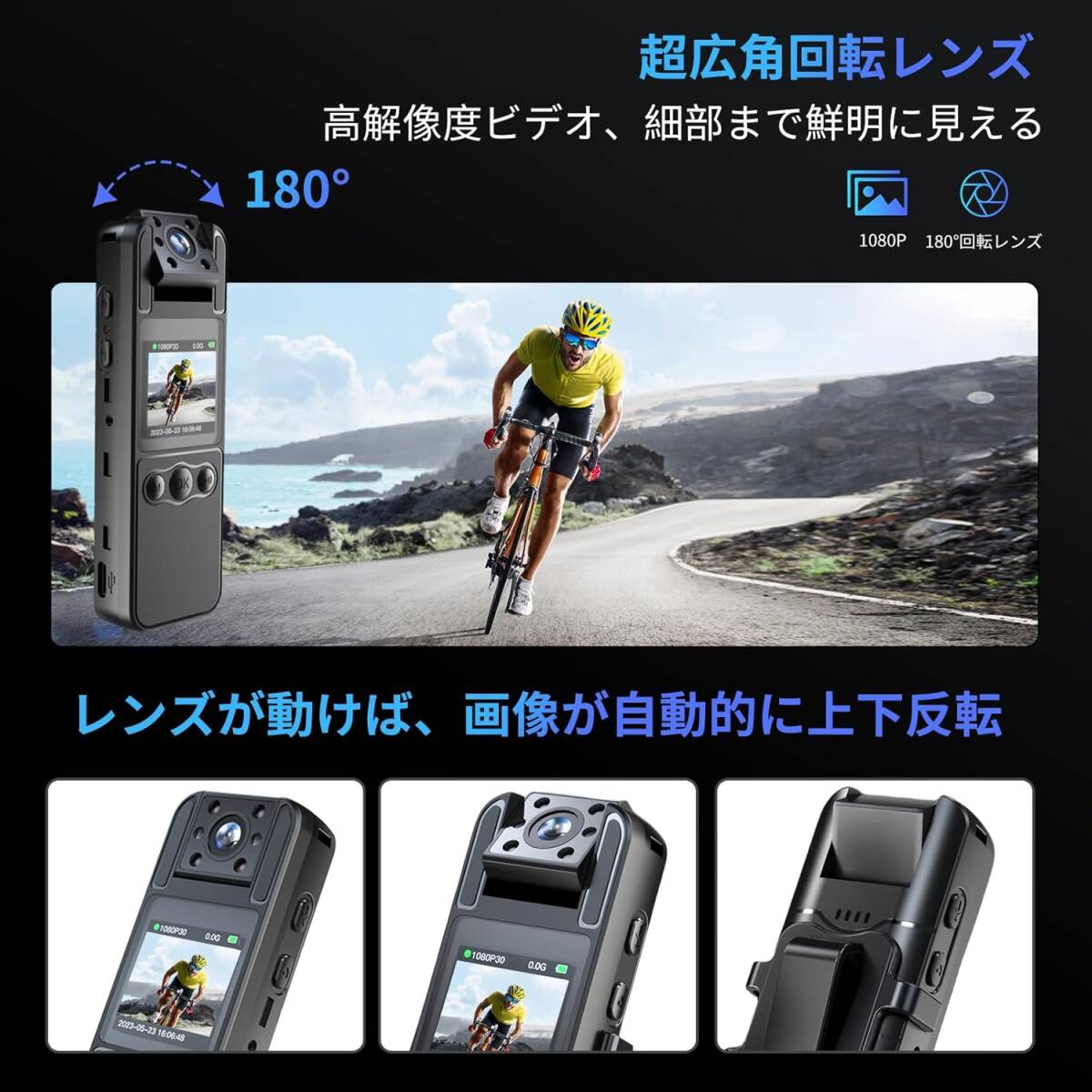 | 「180度超広角回転可能レンズ・ワンクリックで鮮明なマルチアングル録画」180度超広角回転可能レンズで、レンズを反転すると自動的に調整可能です。1.3インチのカラースクリーンが搭載されており、解像度1920*1080のビデオをリアルタイムで確認し、いつでも鮮明な動画を再生できます。夜分は赤外線ナイトビジョンに自動切り替えて、撮影は時間によって制御されず、暗闇での撮影も鮮明で、車中、玄関などにつけて盗難防止に使ってます。 「高画質フルHDで堪能、ワンクリックで美しく撮影」全ての写真を高画質フルHDで堪能でき、3264*2448高解像度で細部まで鮮明で綺麗な映像を見ることができます。録画中は撮影可能で、キャプチャすると画像がアルバムに保存されます。ローカルビデオ再生とステレオ外部再生をサポートします。スマホがOTG機能をサポートしている限り、接続してオーディオ/ビデオを再生したり、Type-C経由でコンピュータに接続して再生したりできます。 「高性能マイク採用でクリアな音声録音を実現、ワンクリック録音で現場を鮮明に復元」音声は画像とリアルタイムで同期し、音質はクリアで、単独でボイスレコーダーとしても使用できます。1600mAhリチウム電池を内蔵し、最長8時間稼働できます。Type-C急速充電をサポートし、充電しながら録画できて、電源オフ時にもビデオを即時に保存できます。ループ録画の機能を備えて、メモリ カードは最大256Gまで対応できます。(SDカードが付属されません) 「ワンクリックで録画/録音/撮影、コンパクトで簡単操作」独立したスイッチボタンレイアウト、ワンクリックだけで録画を開始し、ビデオを保存できます。録画中にスナップショットが可能で、状況証拠用やバイクのドライブレコーダー、会議、授業などを録画・撮影・保存できます。ループ録画機能が付いていて、記録の容量がいっぱいになった場合に、古い映像を自動的に上書きして新しい映像を録画するようになります。動体検知の機能が付いて、ワンタッチアラーム機能、警告音と赤と青のライトが点滅になるので、防犯カメラとしても最適です。 「パノラマ録画に簡単切り替え、様々なシーンに活躍」英語、日本語、中国語などの言語をサポートします。 軟骨三脚が付属され、カメラを固定し、コンピューターに接続して定点カメラとして使用できます。会議商談、サイクリング、授業記録、事故証拠、インタビュー、現場撮影などに適しています。日本語取扱説明書が付属しているので初心者でも気楽に利用できます。M30 |