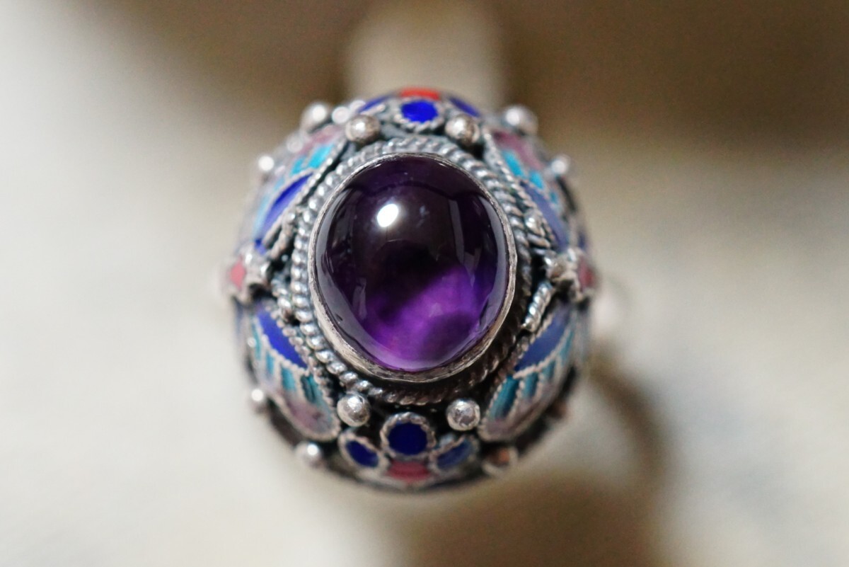 1495 天然アメジスト 七宝焼 焼き物 陶器 リング 指輪 ヴィンテージ アクセサリー SILVER刻印 天然石 色石 宝石 カラーストーン 装飾品 收藏